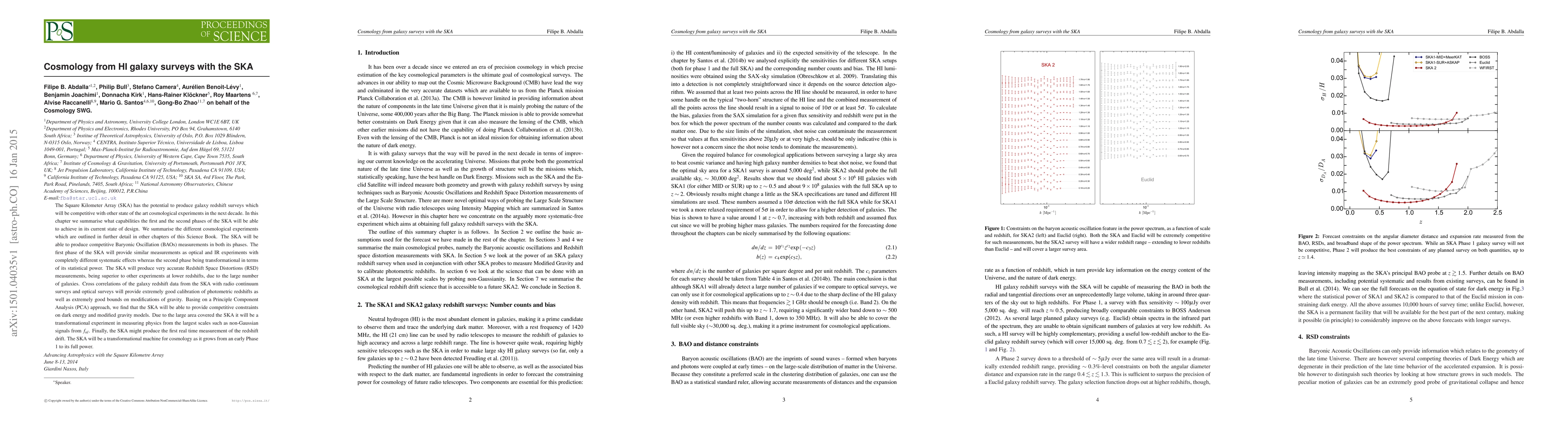 The SKA will enable groundbreaking cosmological studies through HI galaxy surveys, offering competitive Baryonic Oscillation and Redshift Space Distortion measurements, and providing superior constraints on dark energy and modified gravity models. Its growth from Phase 1 to Phase 2 will transform our understanding of the universe's largest scales.