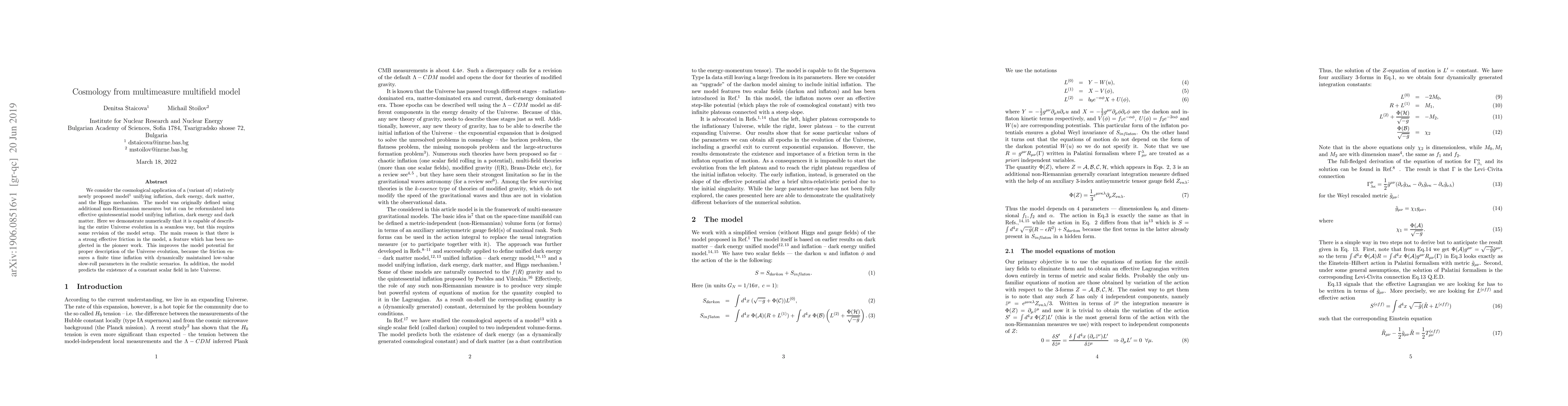 We consider the cosmological application of a (variant of) relatively newly proposed model \cite{1609.06915} unifying inflation, dark energy, dark matter, and the Higgs mechanism. The model was originally defined using additional non-Riemannian measures but it can be reformulated into effective quintessential model unifying inflation, dark energy and dark matter. Here we demonstrate numerically that it is capable of describing the entire Universe evolution in a seamless way, but this requires some revision of the model setup. The main reason is that there is a strong effective friction in the model, a feature which has been neglected in the pioneer work. This improves the model potential for proper description of the Universe evolution, because the friction ensures a finite time inflation with dynamically maintained low-value slow-roll parameters in the realistic scenarios. In addition, the model predicts the existence of a constant scalar field in late Universe.