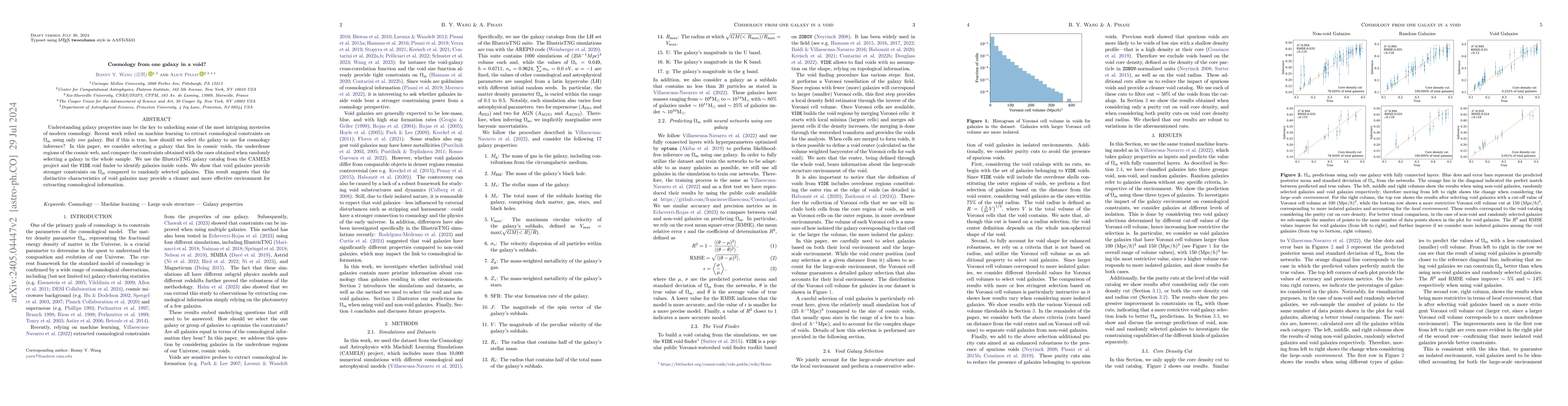 The research utilized the IllustrisTNG galaxy catalog from the CAMELS project and the VIDE void finder to identify galaxies inside voids. Machine learning models were employed to predict cosmological parameters, specifically $\Omega_\mathrm{m}$, using one galaxy from voids, non-voids, and randomly selected galaxies.