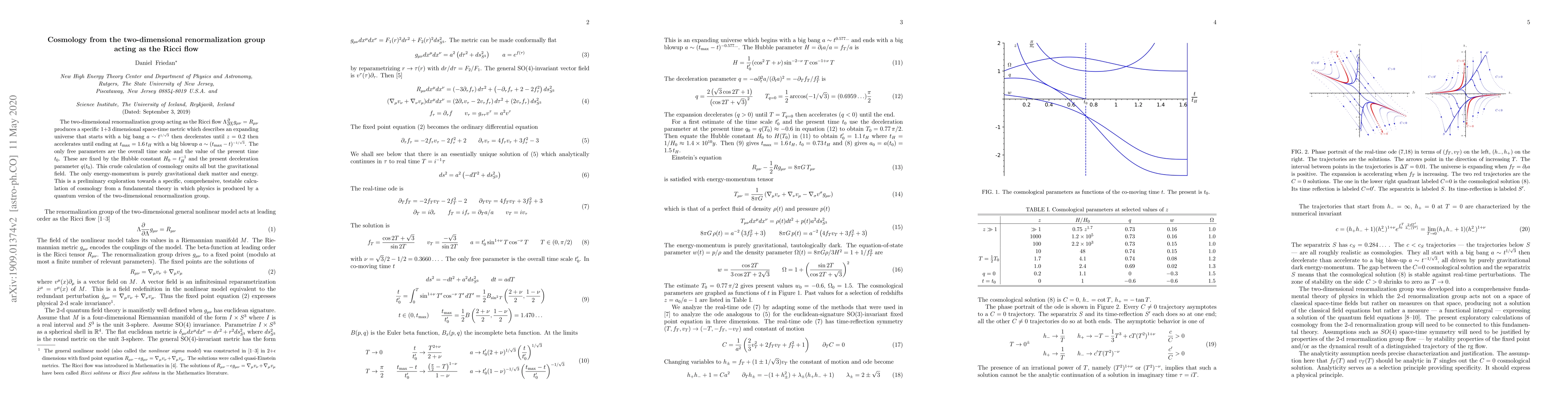 The two-dimensional renormalization group acting as the Ricci flow $\Lambda\frac{\partial}{\partial\Lambda} g_{\mu\nu} = R_{\mu\nu}$ produces a specific 1+3 dimensional space-time metric which describes an expanding universe that starts with a big bang $a \sim t^{\scriptscriptstyle 1/\sqrt3}$ then decelerates until $z=0.2$ then accelerates until ending at $t_{\max}=1.6\,t_{H}$ with a big blowup $a \sim (t_{\max}-t)^{\scriptscriptstyle -1/\sqrt3}$. The only free parameters are the overall time scale and the value of the present time $t_{0}$. These are fixed by the Hubble constant $H_{0}=t_{H}^{-1}$ and the present deceleration parameter $q(t_{0})$. This crude calculation of cosmology omits all but the gravitational field. The only energy-momentum is purely gravitational dark matter and energy. This is a preliminary exploration towards a specific, comprehensive, testable calculation of cosmology from a fundamental theory in which physics is produced by a quantum version of the two-dimensional renormalization group.
