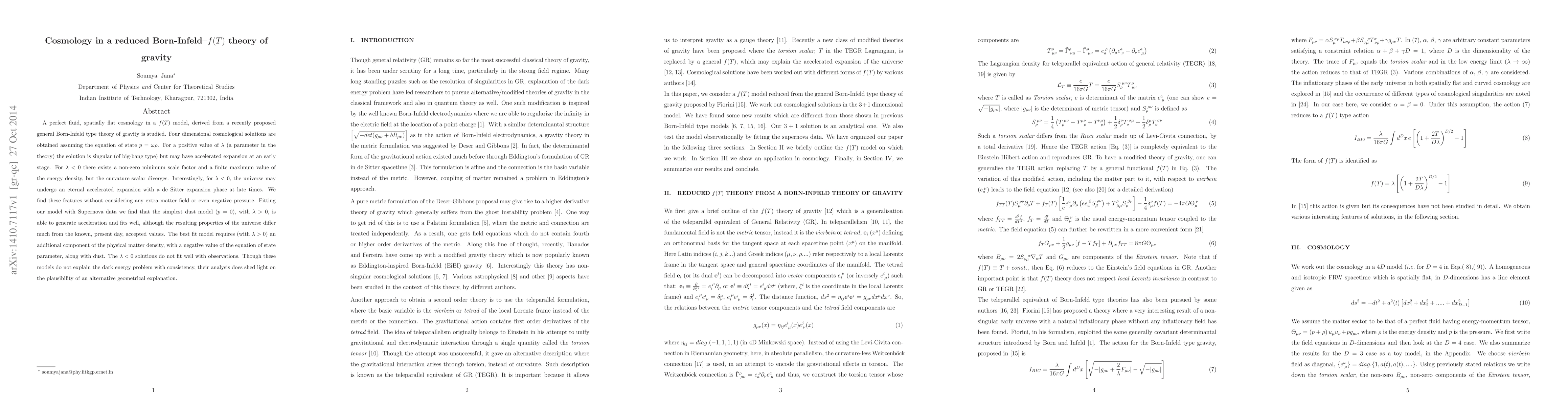 A perfect fluid, spatially flat cosmology in a $f(T)$ model, derived from a recently proposed general Born-Infeld type theory of gravity is studied. Four dimensional cosmological solutions are obtained assuming the equation of state $p=\omega \rho$. For a positive value of $\lambda $ (a parameter in the theory) the solution is singular (of big-bang type) but may have accelerated expansion at an early stage. For $\lambda<0$ there exists a non-zero minimum scale factor and a finite maximum value of the energy density, but the curvature scalar diverges. Interestingly, for $\lambda <0$, the universe may undergo an eternal accelerated expansion with a de Sitter expansion phase at late times. We find these features without considering any extra matter field or even negative pressure. Fitting our model with Supernova data we find that the simplest dust model ($p=0$), with $\lambda >0$, is able to generate acceleration and fits well, although the resulting properties of the universe differ much from the known, present day, accepted values. The best fit model requires (with $\lambda > 0$) an additional component of the physical matter density, with a negative value of the equation of state parameter, along with dust. The $\lambda < 0$ solutions do not fit well with observations. Though these models do not explain the dark energy problem with consistency, their analysis does shed light on the plausibility of an alternative geometrical explanation.