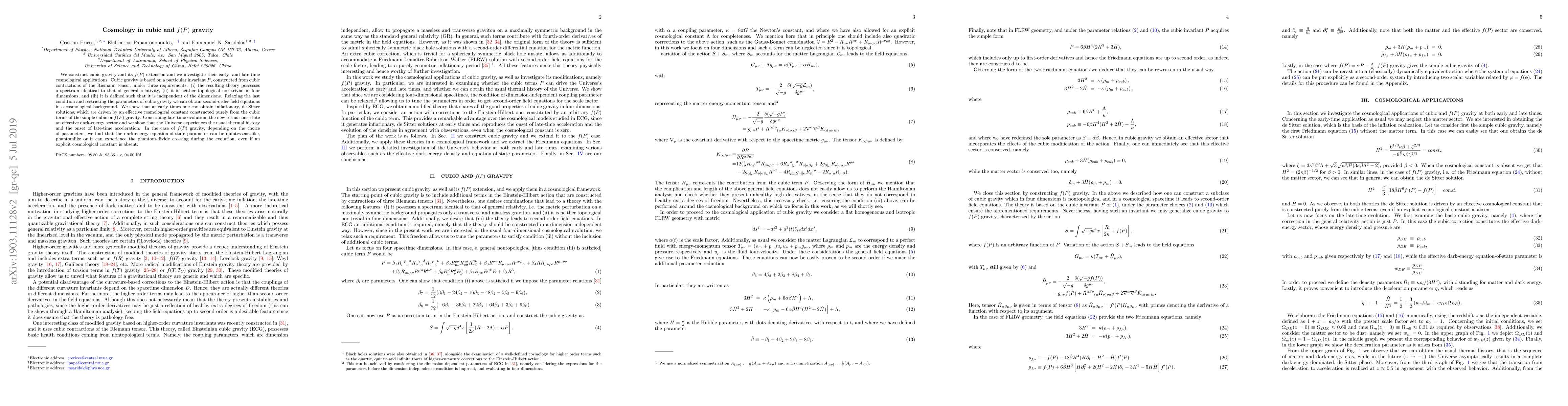 We construct cubic gravity and its $f(P)$ extension and we investigate their early- and late-time cosmological applications. Cubic gravity is based on a particular invariant $P$, constructed from cubic contractions of the Riemann tensor, under three requirements: (i) the resulting theory possesses a spectrum identical to that of general relativity, (ii) it is neither topological nor trivial in four dimensions, and (iii) it is defined such that it is independent of the dimensions. Relaxing the last condition and restricting the parameters of cubic gravity we can obtain second-order field equations in a cosmological background. We show that at early times one can obtain inflationary, de Sitter solutions, which are driven by an effective cosmological constant constructed purely from the cubic terms of the simple cubic or $f(P)$ gravity. Concerning late-time evolution, the new terms constitute an effective dark-energy sector and we show that the Universe experiences the usual thermal history and the onset of late-time acceleration. In the case of $f(P)$ gravity, depending on the choice of parameters, we find that the dark-energy equation-of-state parameter can be quintessencelike, phantomlike or it can experience the phantom-divide crossing during the evolution, even if an explicit cosmological constant is absent.