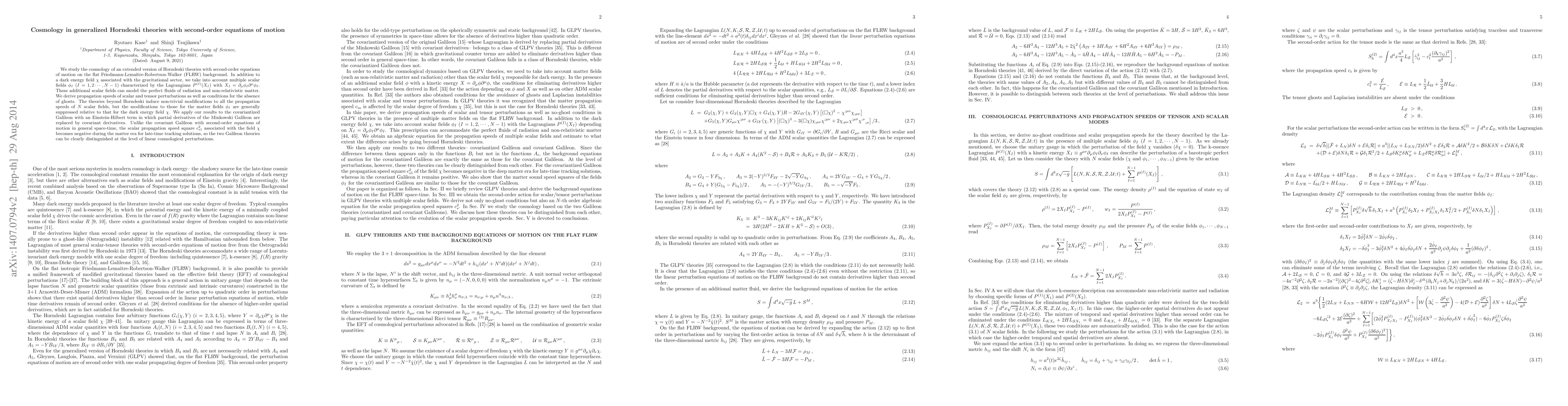 This paper explores the cosmology of generalized Horndeski theories with additional scalar fields on a flat FLRW background, deriving conditions for the absence of ghosts and analyzing the propagation speeds of perturbations. It finds that while the theories modify the propagation speeds of all scalar fields, the effects on matter fields are generally suppressed, and the covariant Galileon with an Einstein-Hilbert term exhibits a negative scalar propagation speed during the matter era, distinguishing it from other Galileon theories.