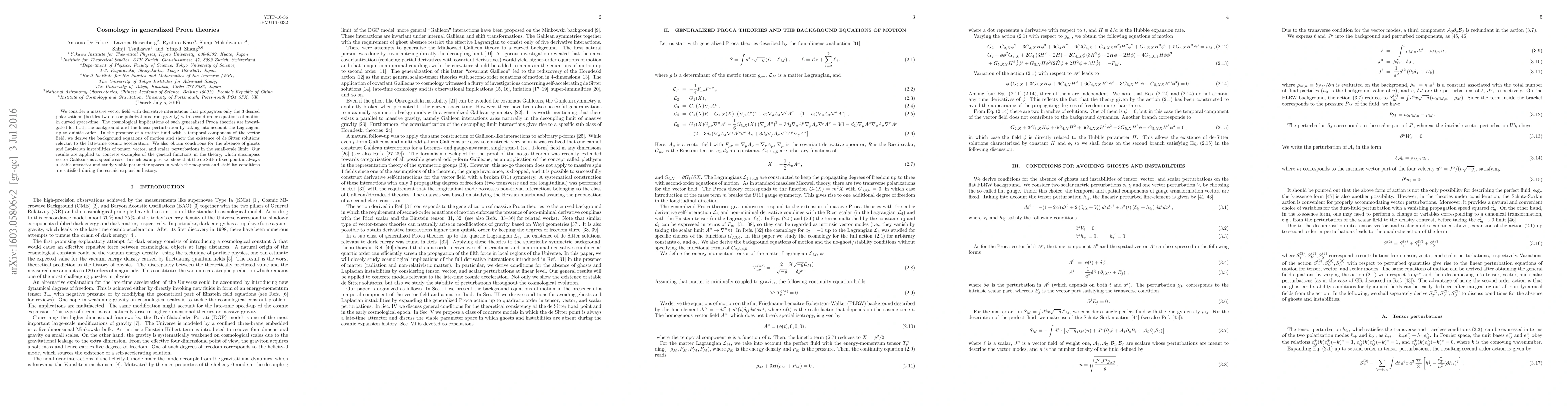 This research explores generalized Proca theories with massive vector fields, demonstrating second-order equations of motion in curved spacetime. It identifies de Sitter solutions for late-time cosmic acceleration and establishes conditions to avoid ghosts and instabilities in perturbations. The study applies these findings to vector Galileon examples, ensuring the de Sitter fixed point's stability and examining viable parameter spaces for no-ghost and stability conditions during cosmic expansion.