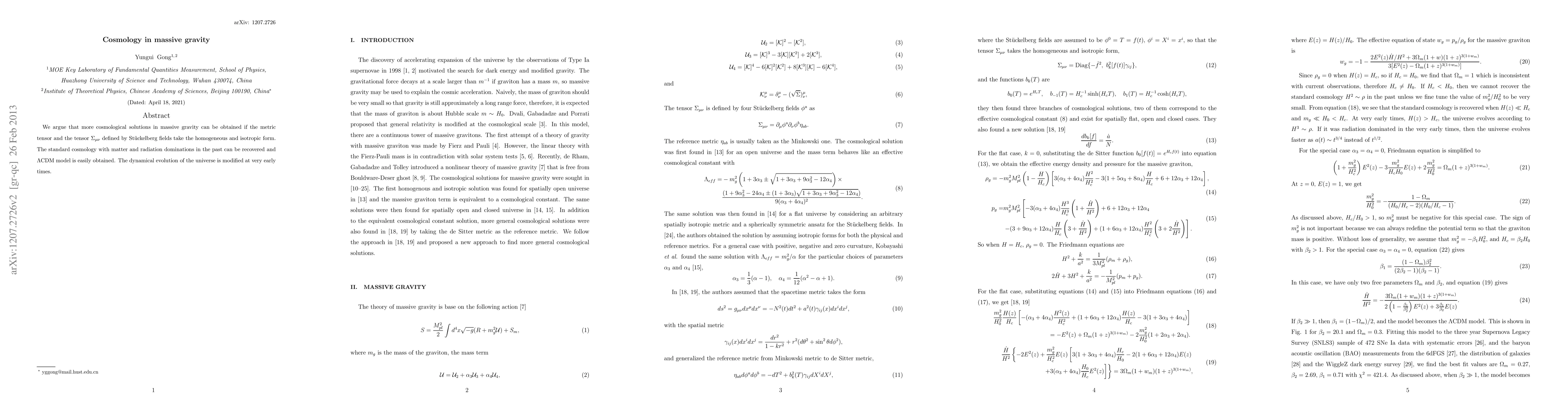 This paper explores cosmological solutions in massive gravity, demonstrating that homogeneous and isotropic forms of the metric tensor and Stueckelberg tensor $\Sigma_{\mu\nu}$ lead to recoverable standard cosmologies, including a $\Lambda$CDM model, with modified early universe dynamics.