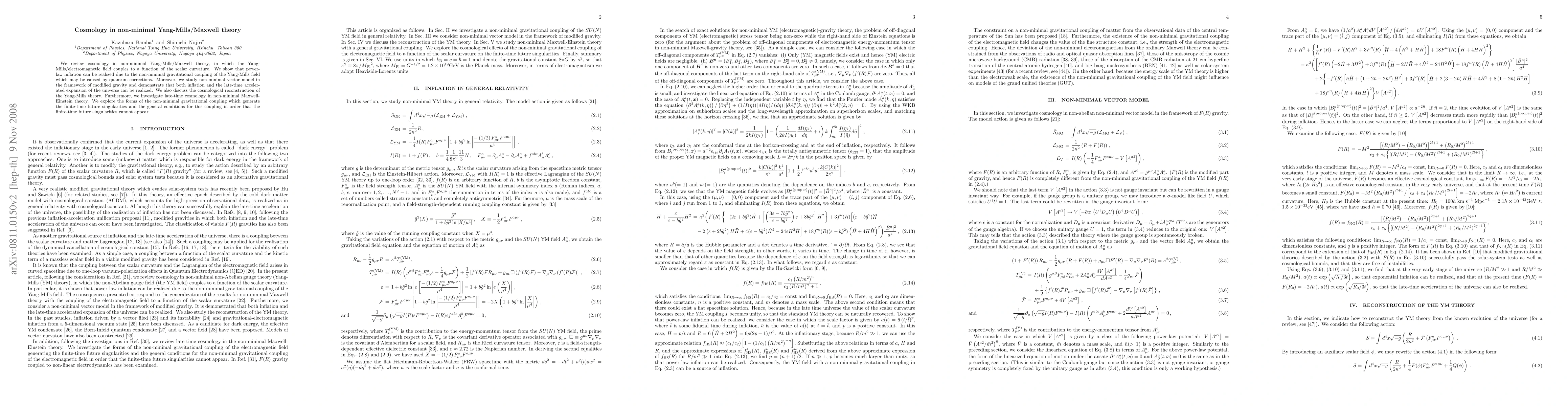 This paper reviews cosmology in non-minimal Yang-Mills/Maxwell theories where the fields couple to scalar curvature, demonstrating that power-law inflation and late-time accelerated expansion can occur due to these non-minimal couplings, with implications for both early and late-time universe singularities.