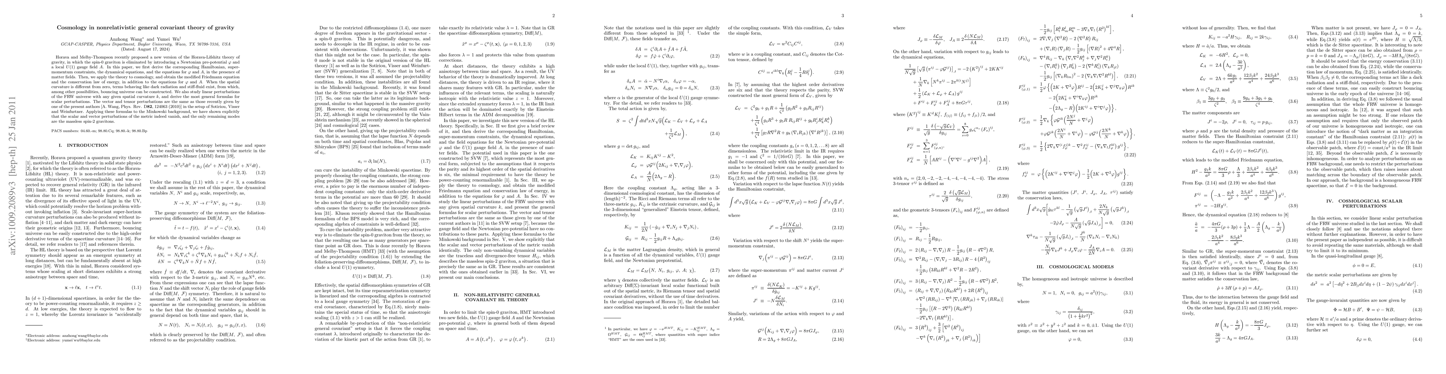 Horava and Melby-Thompson recently proposed a new version of the Horava-Lifshitz theory of gravity, in which the spin-0 graviton is eliminated by introducing a Newtonian pre-potential $\phi$ and a local U(1) gauge field $A$. In this paper, we first derive the corresponding Hamiltonian, super-momentum constraints, the dynamical equations, and the equations for $\phi$ and $A$, in the presence of matter fields. Then, we apply the theory to cosmology, and obtain the modified Friedmann equation and the conservation law of energy, in addition to the equations for $\phi$ and $A$. When the spatial curvature is different from zero, terms behaving like dark radiation and stiff-fluid exist, from which, among other possibilities, bouncing universe can be constructed. We also study linear perturbations of the FRW universe with any given spatial curvature $k$, and derive the most general formulas for scalar perturbations. The vector and tensor perturbations are the same as those recently given by one of the present authors [A. Wang, Phys. Rev. D{\bf 82}, 124063 (2010)] in the setup of Sotiriou, Visser and Weinfurtner. Applying these formulas to the Minkowski background, we have shown explicitly that the scalar and vector perturbations of the metric indeed vanish, and the only remaining modes are the massless spin-2 gravitons.