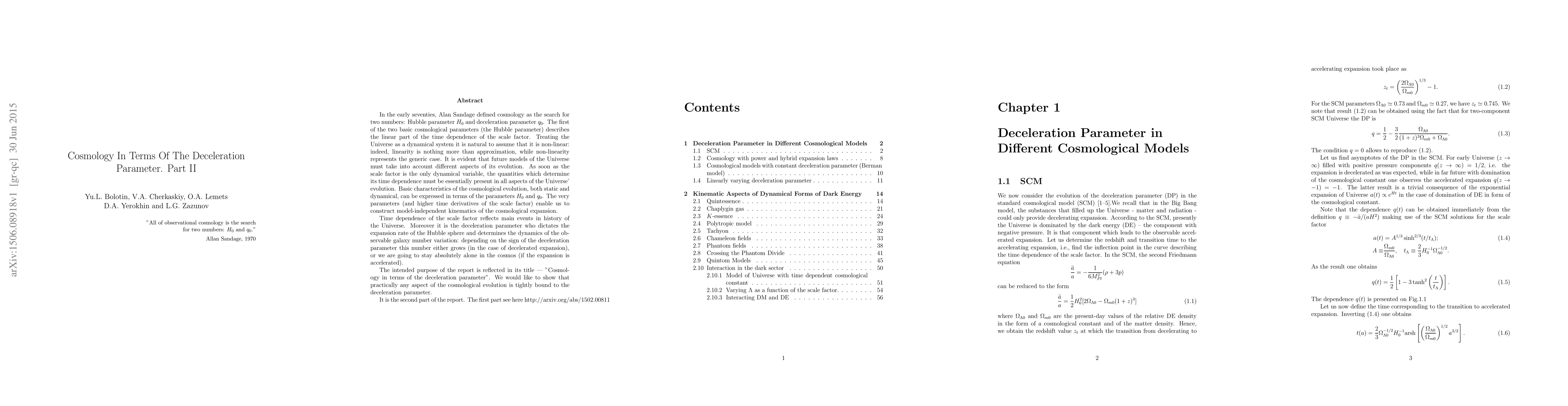 In the early seventies, Alan Sandage defined cosmology as the search for two numbers: Hubble parameter ${{H}_{0}}$ and deceleration parameter ${{q}_{0}}$. The first of the two basic cosmological parameters (the Hubble parameter) describes the linear part of the time dependence of the scale factor. Treating the Universe as a dynamical system it is natural to assume that it is non-linear: indeed, linearity is nothing more than approximation, while non-linearity represents the generic case. It is evident that future models of the Universe must take into account different aspects of its evolution. As soon as the scale factor is the only dynamical variable, the quantities which determine its time dependence must be essentially present in all aspects of the Universe' evolution. Basic characteristics of the cosmological evolution, both static and dynamical, can be expressed in terms of the parameters ${{H}_{0}}$ and ${{q}_{0}}$. The very parameters (and higher time derivatives of the scale factor) enable us to construct model-independent kinematics of the cosmological expansion. Time dependence of the scale factor reflects main events in history of the Universe. Moreover it is the deceleration parameter who dictates the expansion rate of the Hubble sphere and determines the dynamics of the observable galaxy number variation: depending on the sign of the deceleration parameter this number either grows (in the case of decelerated expansion), or we are going to stay absolutely alone in the cosmos (if the expansion is accelerated). The intended purpose of the report is reflected in its title --- "Cosmology in terms of the deceleration parameter". We would like to show that practically any aspect of the cosmological evolution is tightly bound to the deceleration parameter. It is the second part of the report. The first part see here http://arxiv.org/abs/1502.00811