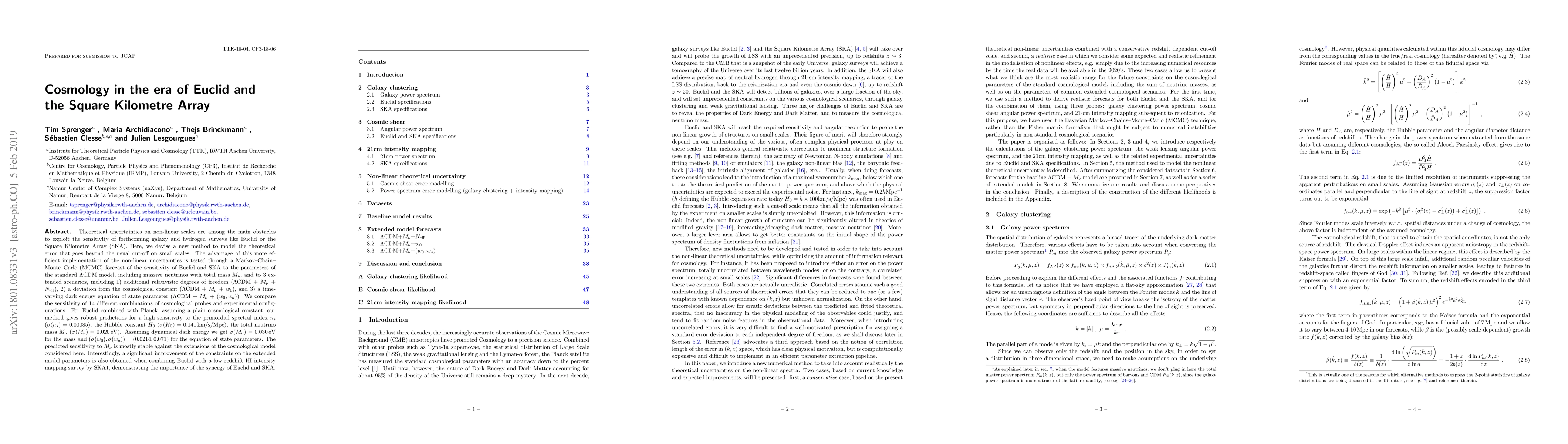 Theoretical uncertainties on non-linear scales are among the main obstacles to exploit the sensitivity of forthcoming galaxy and hydrogen surveys like Euclid or the Square Kilometre Array (SKA). Here, we devise a new method to model the theoretical error that goes beyond the usual cut-off on small scales. The advantage of this more efficient implementation of the non-linear uncertainties is tested through a Markov-Chain-Monte-Carlo (MCMC) forecast of the sensitivity of Euclid and SKA to the parameters of the standard $\Lambda$CDM model, including massive neutrinos with total mass $M_\nu$, and to 3 extended scenarios, including 1) additional relativistic degrees of freedom ($\Lambda$CDM + $M_\nu$ + $N_\mathrm{eff}$), 2) a deviation from the cosmological constant ($\Lambda$CDM + $M_\nu$ + $w_0$), and 3) a time-varying dark energy equation of state parameter ($\Lambda$CDM + $M_\nu$ + $\left(w_0,w_a \right)$). We compare the sensitivity of 14 different combinations of cosmological probes and experimental configurations. For Euclid combined with Planck, assuming a plain cosmological constant, our method gives robust predictions for a high sensitivity to the primordial spectral index $n_{\rm s}$ ($\sigma(n_s)=0.00085$), the Hubble constant $H_0$ ($\sigma(H_0)=0.141 \, {\rm km/s/Mpc}$), the total neutrino mass $M_\nu$ ($\sigma(M_\nu)=0.020 \, {\rm eV}$). Assuming dynamical dark energy we get $\sigma(M_\nu)=0.030 \, {\rm eV}$ for the mass and $(\sigma(w_0), \sigma(w_a)) = (0.0214, 0.071)$ for the equation of state parameters. The predicted sensitivity to $M_\nu$ is mostly stable against the extensions of the cosmological model considered here. Interestingly, a significant improvement of the constraints on the extended model parameters is also obtained when combining Euclid with a low redshift HI intensity mapping survey by SKA1, demonstrating the importance of the synergy of Euclid and SKA.