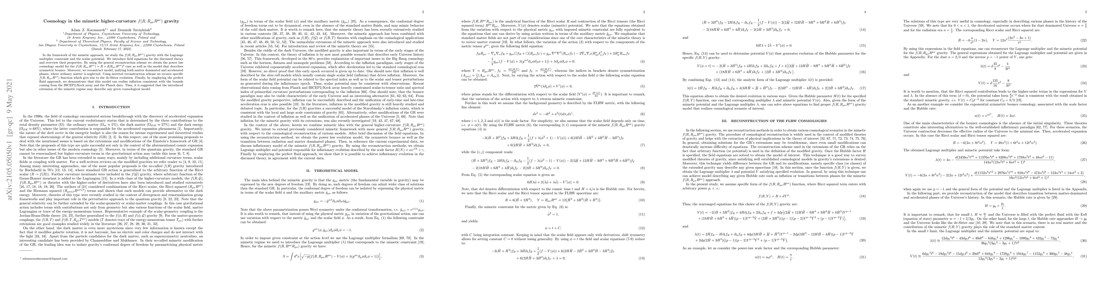 In the framework of the mimetic approach, we study the $f(R,R_{\mu\nu}R^{\mu\nu})$ gravity with the Lagrange multiplier constraint and the scalar potential. We introduce field equations for the discussed theory and overview their properties. By using the general reconstruction scheme we obtain the power law cosmology model for the $f(R,R_{\mu\nu}R^{\mu\nu})=R+d(R_{\mu\nu}R^{\mu\nu})^p$ case as well as the model that describes symmetric bounce. Moreover, we reconstruct model, unifying both matter dominated and accelerated phases, where ordinary matter is neglected. Using inverted reconstruction scheme we recover specific $f(R,R_{\mu\nu}R^{\mu\nu})$ function which give rise to the de-Sitter evolution. Finally, by employing the perfect fluid approach, we demonstrate that this model can realize inflation consistent with the bounds coming from the BICEP2/Keck array and the Planck data. Thus, it is suggested that the introduced extension of the mimetic regime may describe any given cosmological model.