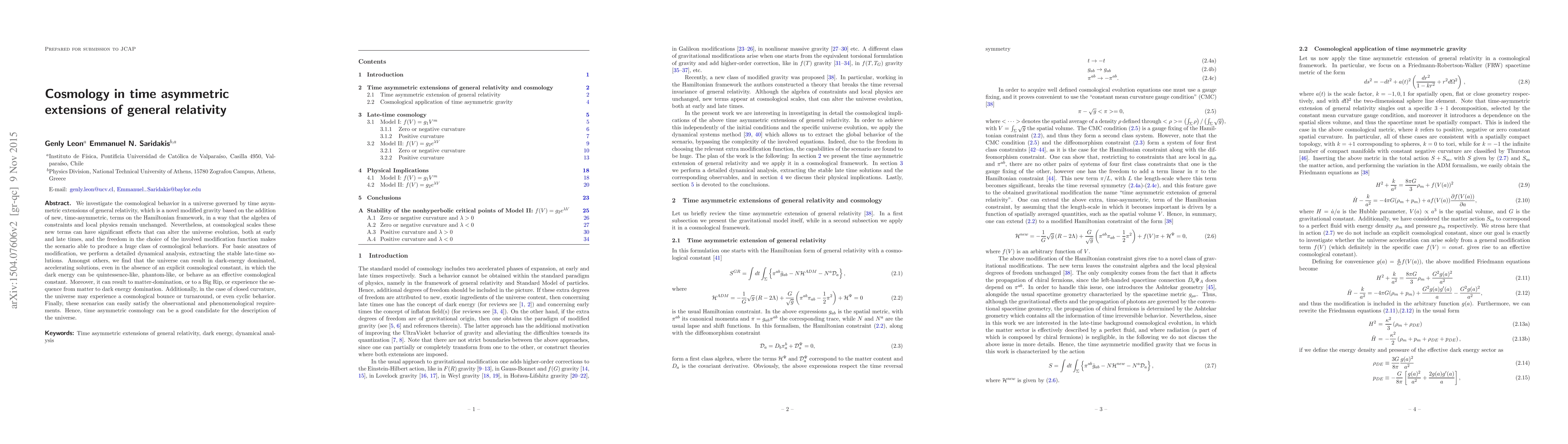 This paper explores the cosmological implications of time asymmetric extensions of general relativity, revealing diverse evolutionary paths for the universe, including dark-energy domination, Big Rip, and cyclic behavior, without requiring an explicit cosmological constant. These modifications offer a flexible framework that can satisfy observational constraints.