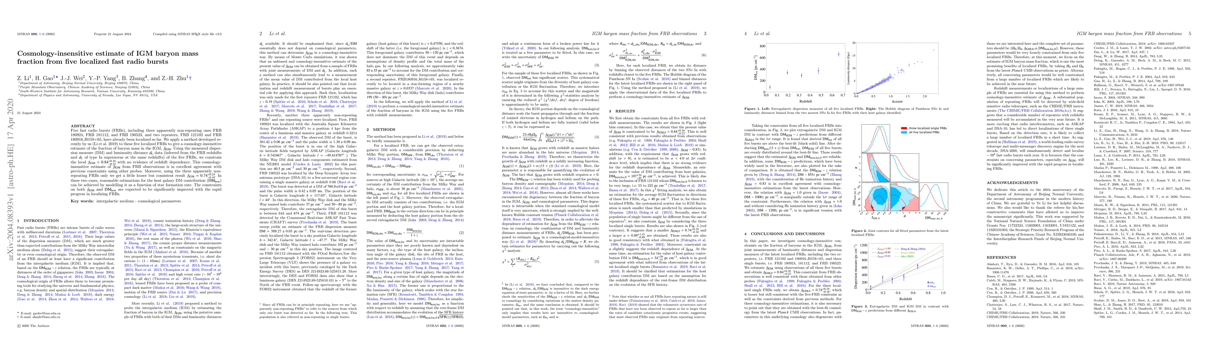 This paper estimates the baryon mass fraction in the intergalactic medium (IGM) using dispersion measures and luminosity distances from five localized fast radio bursts (FRBs). The study finds a cosmology-insensitive baryon mass fraction $f_{\rm IGM} = 0.84^{+0.16}_{-0.22}$, consistent with previous estimates, and suggests that further FRB localizations will improve these constraints.