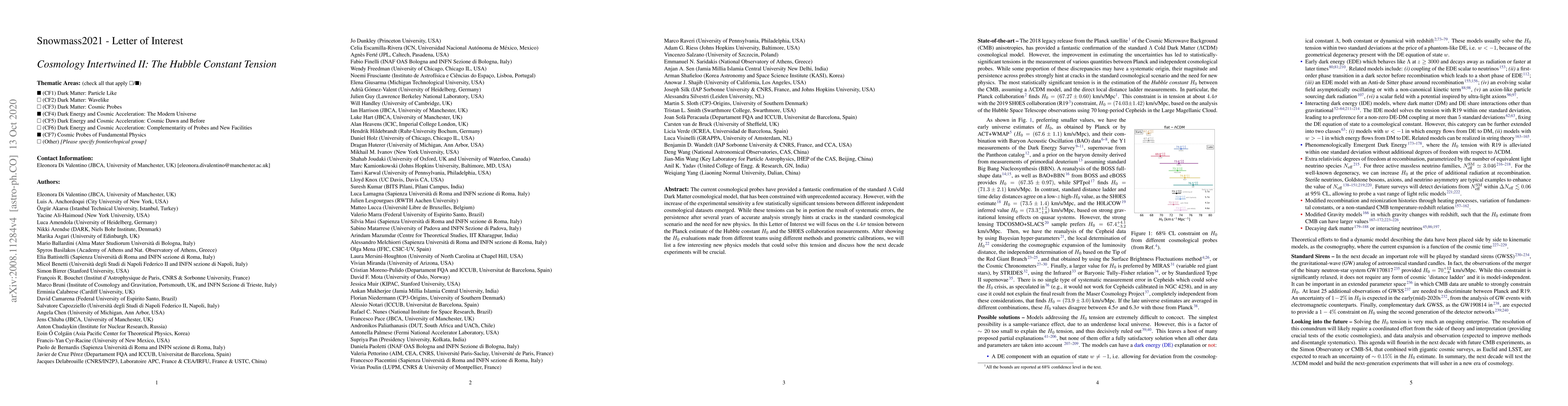 The current cosmological probes have provided a fantastic confirmation of the standard $\Lambda$ Cold Dark Matter cosmological model, that has been constrained with unprecedented accuracy. However, with the increase of the experimental sensitivity a few statistically significant tensions between different independent cosmological datasets emerged. While these tensions can be in portion the result of systematic errors, the persistence after several years of accurate analysis strongly hints at cracks in the standard cosmological scenario and the need for new physics. In this Letter of Interest we will focus on the $4.4\sigma$ tension between the Planck estimate of the Hubble constant $H_0$ and the SH0ES collaboration measurements. After showing the $H_0$ evaluations made from different teams using different methods and geometric calibrations, we will list a few interesting new physics models that could solve this tension and discuss how the next decade experiments will be crucial.