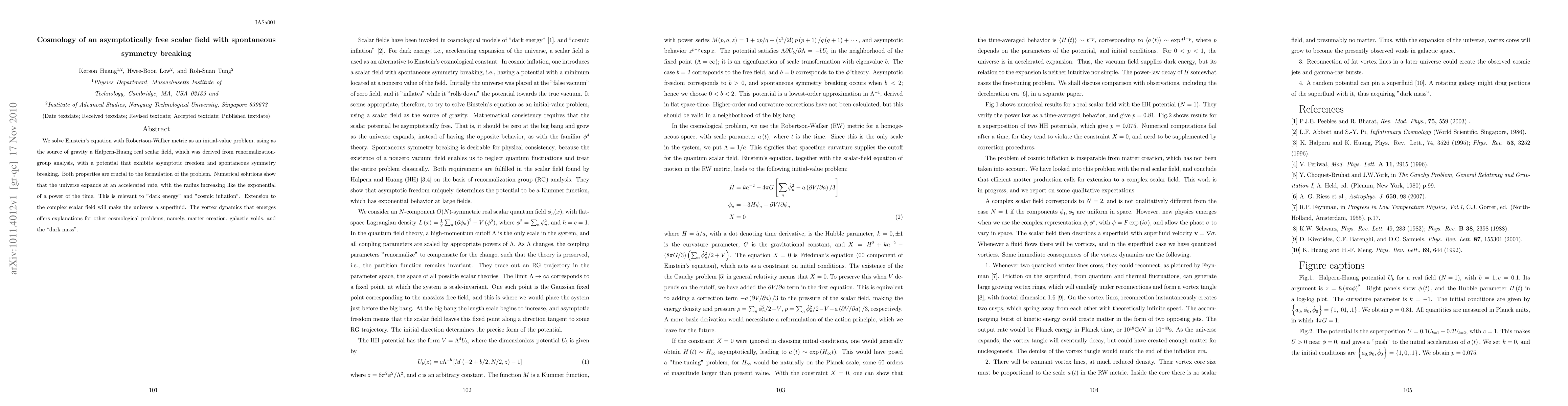 This research presents a cosmological model using an asymptotically free scalar field with spontaneous symmetry breaking, derived from renormalization-group analysis. Numerical solutions reveal an accelerated universe expansion, relevant for dark energy and cosmic inflation, with potential extensions to superfluid universes explaining cosmological issues like matter creation and galactic voids.