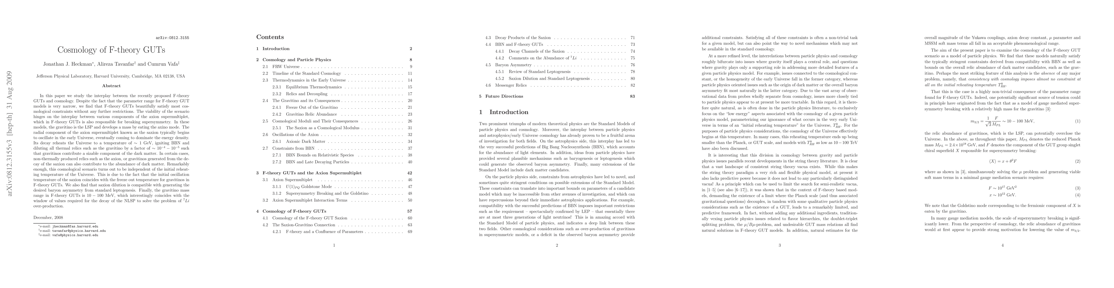 This paper explores how F-theory Grand Unified Theories (GUTs) align with cosmological constraints, revealing that the saxion from the axion supermultiplet dominates early Universe energy density, reheats the Universe, and dilutes dark matter relics. The gravitino, as the lightest supersymmetric particle (LSP), contributes significantly to dark matter and its mass range coincides with the solution for the Li(7) over-production problem.