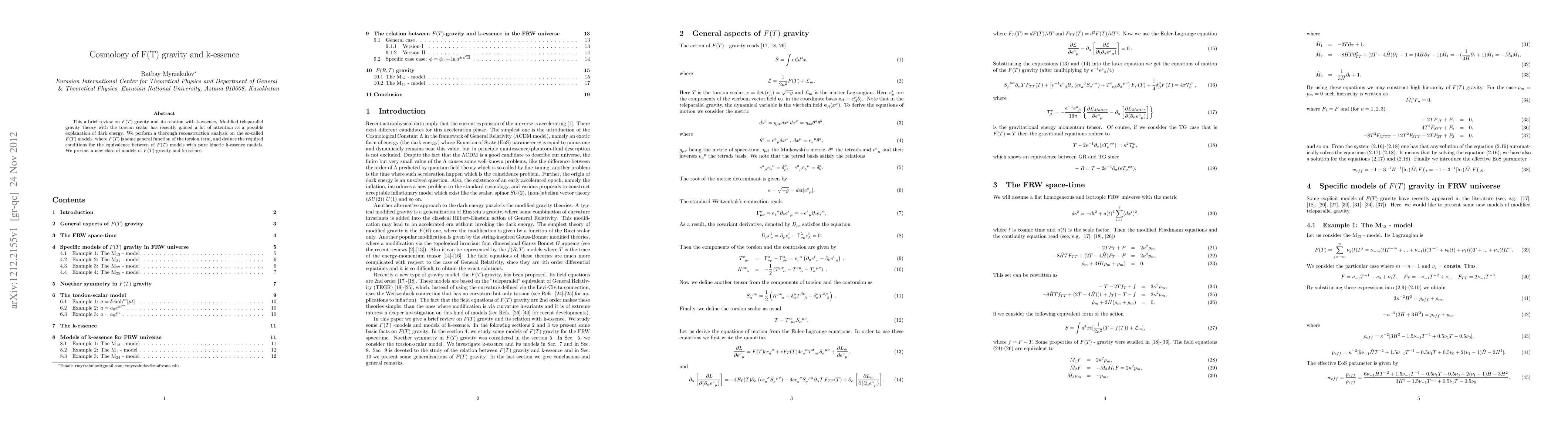 This paper reviews $F(T)$ gravity, a modified teleparallel theory, and explores its equivalence with k-essence models. It reconstructs $F(T)$ models and introduces a new class of $F(T)$-gravity and k-essence models.