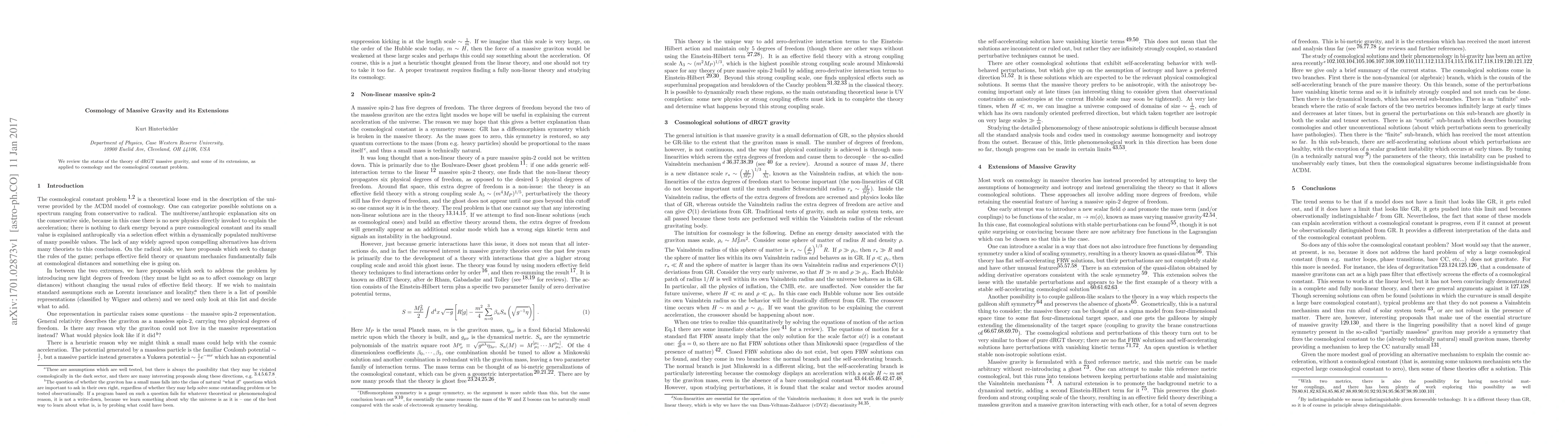 We review the status of the theory of dRGT massive gravity, and some of its extensions, as applied to cosmology and the cosmological constant problem.