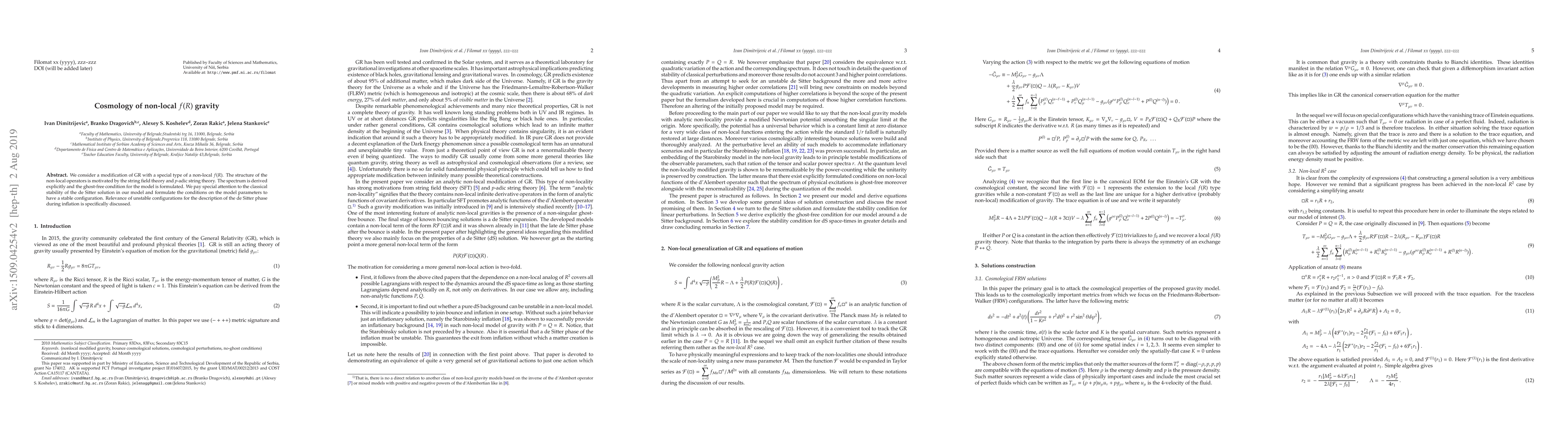 This paper explores a modified version of general relativity using non-local f(R) gravity, motivated by string field theory, and derives the spectrum and ghost-free conditions. It focuses on the classical stability of the de Sitter solution and discusses the implications for the de Sitter phase during inflation.
