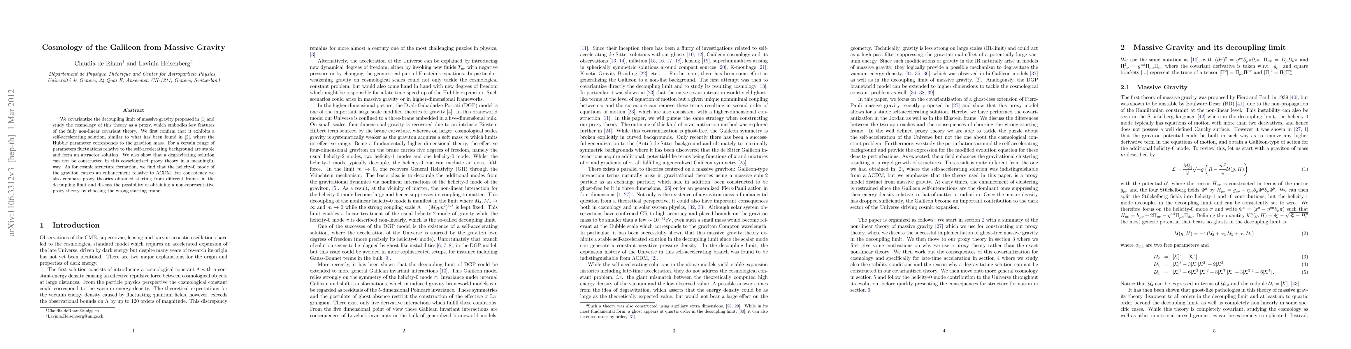This paper studies the cosmology of a covariantized version of the decoupling limit of massive gravity, confirming its self-accelerating solutions and stability of fluctuations. It finds that the helicity-0 mode enhances cosmic structure formation compared to ΛCDM, and discusses the implications of different starting frames in the decoupling limit.
