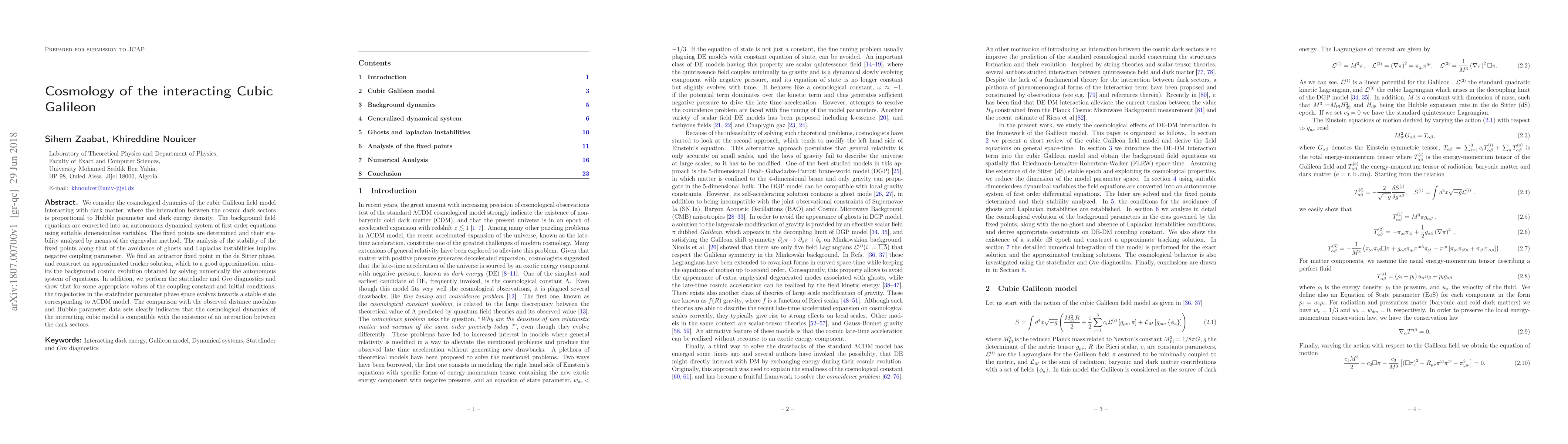 The paper investigates the cosmological dynamics of an interacting Cubic Galileon model with dark matter, finding an attractor fixed point in the de Sitter phase that mimics cosmic evolution and suggests compatibility with dark sector interaction.