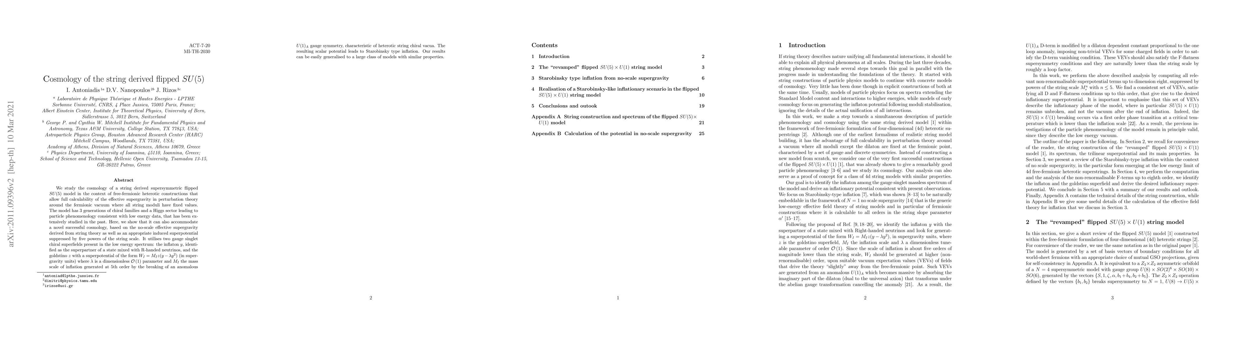 This paper explores the cosmology of a supersymmetric flipped $SU(5)$ model derived from string theory, focusing on its effective supergravity and potential for inflation. It utilizes two gauge singlet chiral superfields, the inflaton $y$ and the goldstino $z$, to achieve Starobinsky type inflation, demonstrating a novel cosmological framework consistent with low-energy particle phenomenology.