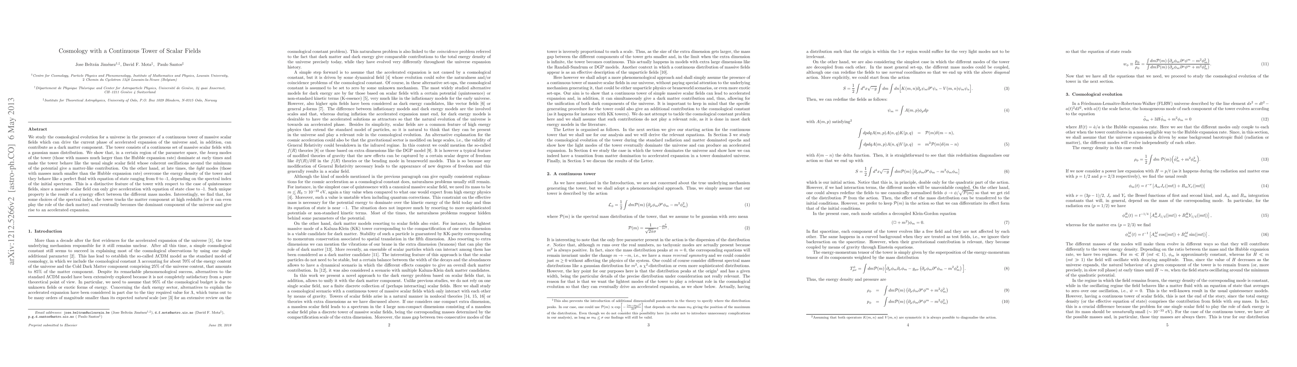 We study the cosmological evolution for a universe in the presence of a continuous tower of massive scalar fields which can drive the current phase of accelerated expansion of the universe and, in addition, can contribute as a dark matter component. The tower consists of a continuous set of massive scalar fields with a gaussian mass distribution. We show that, in a certain region of the parameter space, the {\it heavy} modes of the tower (those with masses much larger than the Hubble expansion rate) dominate at early times and make the tower behave like the usual single scalar field whose coherent oscillations around the minimum of the potential give a matter-like contribution. On the other hand, at late times, the {\it light} modes (those with masses much smaller than the Hubble expansion rate) overcome the energy density of the tower and they behave like a perfect fluid with equation of state ranging from 0 to -1, depending on the spectral index of the initial spectrum. This is a distinctive feature of the tower with respect to the case of quintessence fields, since a massive scalar field can only give acceleration with equation of state close to -1. Such unique property is the result of a synergy effect between the different mass modes. Interestingly, we find that, for some choices of the spectral index, the tower tracks the matter component at high redshifts (or it can even play the role of the dark matter) and eventually becomes the dominant component of the universe and give rise to an accelerated expansion.