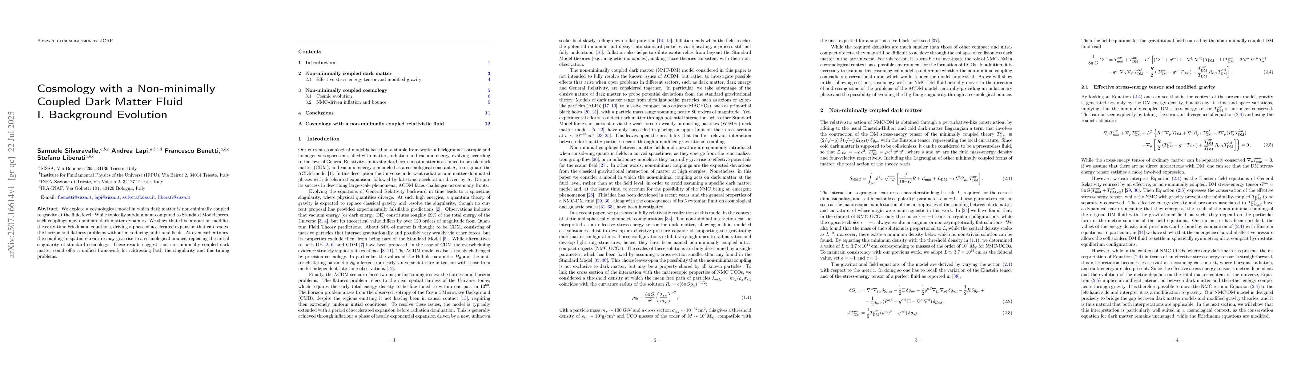 The paper introduces a non-minimally coupled dark matter model that modifies Friedmann equations, leading to an early accelerated expansion phase and a cosmological bounce, potentially resolving horizon and flatness problems without introducing new fields.