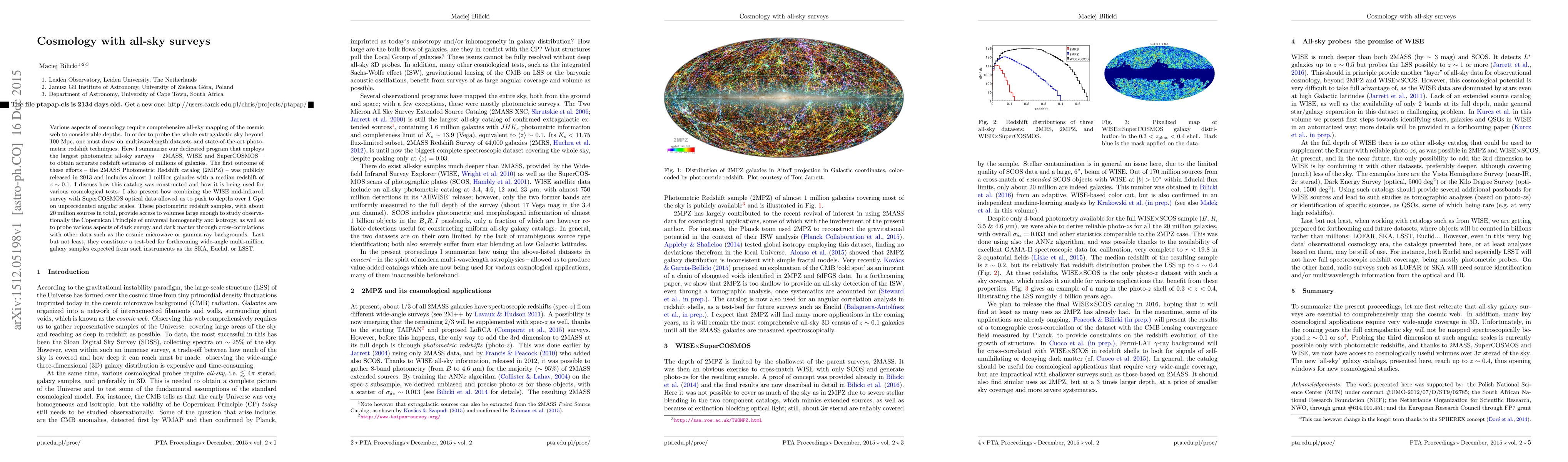 This paper outlines a comprehensive program using all-sky surveys like 2MASS, WISE, and SuperCOSMOS to create accurate photometric redshift estimates for millions of galaxies, facilitating cosmological studies. The 2MPZ catalog, released in 2013, serves as a foundational dataset for probing the universe's homogeneity and isotropy, as well as for investigating dark energy and dark matter.