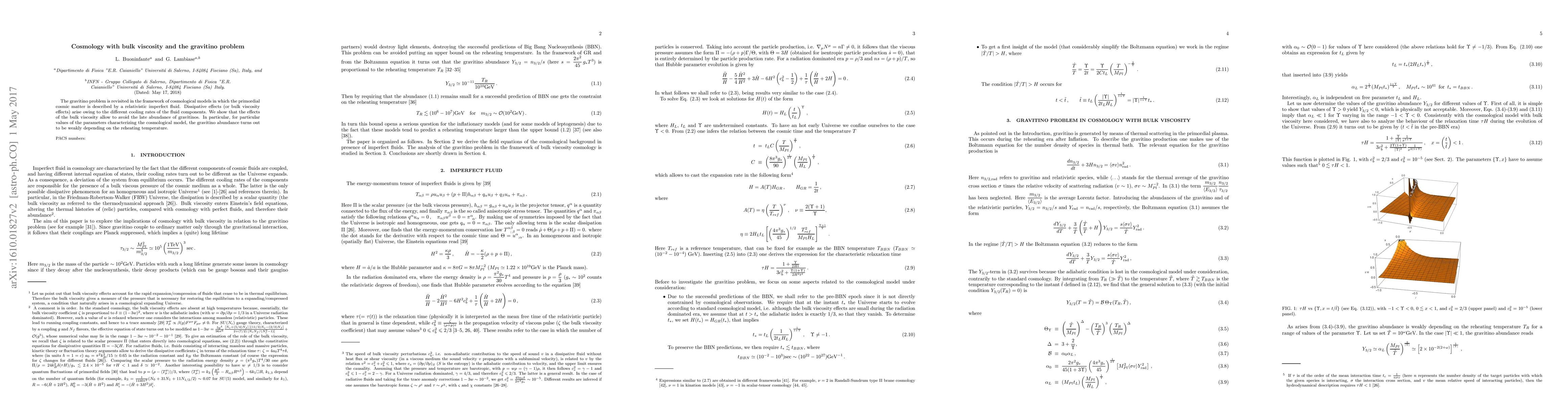 The gravitino problem is revisited in the framework of cosmological models in which the primordial cosmic matter is described by a relativistic imperfect fluid. Dissipative effects (or bulk viscosity effects) arise owing to the different cooling rates of the fluid components. We show that the effects of the bulk viscosity allow to avoid the late abundance of gravitinos. In particular, we found that for a particular choice of the parameters characterizing the cosmological model, the gravitino abundance turns out to be independent on the reheating temperature.