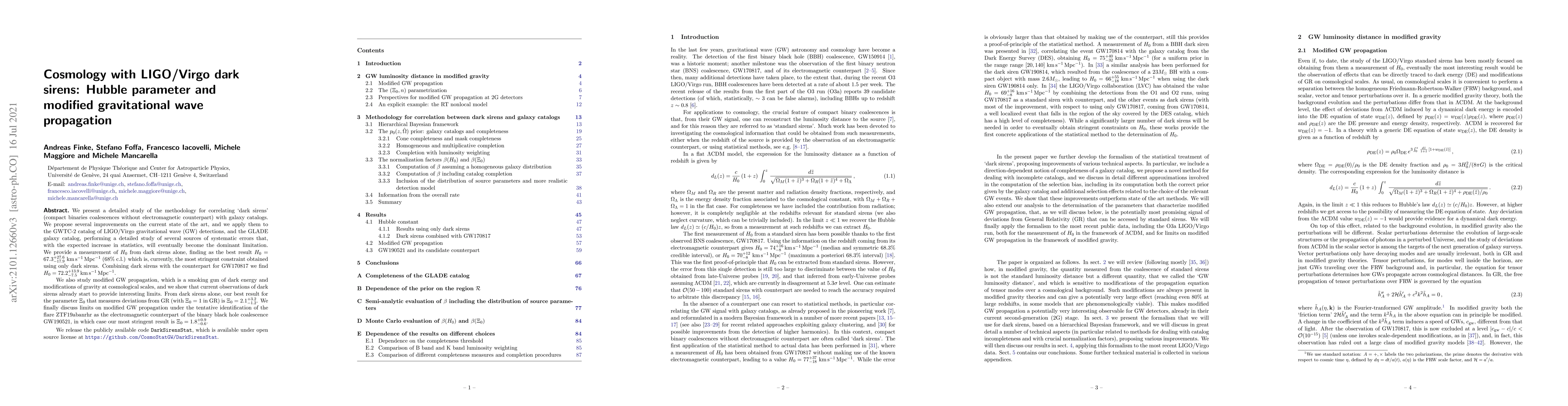 We present a detailed study of the methodology for correlating `dark sirens' (compact binaries coalescences without electromagnetic counterpart) with galaxy catalogs. We propose several improvements on the current state of the art, and we apply them to the GWTC-2 catalog of LIGO/Virgo gravitational wave (GW) detections, and the GLADE galaxy catalog, performing a detailed study of several sources of systematic errors that, with the expected increase in statistics, will eventually become the dominant limitation. We provide a measurement of $H_0$ from dark sirens alone, finding as the best result $H_0=67.3^{+27.6}_{-17.9}\,\,{\rm km}\, {\rm s}^{-1}\, {\rm Mpc}^{-1}$ ($68\%$ c.l.) which is, currently, the most stringent constraint obtained using only dark sirens. Combining dark sirens with the counterpart for GW170817 we find $H_0= 72.2^{+13.9}_{-7.5} \,{\rm km}\, {\rm s}^{-1}\, {\rm Mpc}^{-1}$. We also study modified GW propagation, which is a smoking gun of dark energy and modifications of gravity at cosmological scales, and we show that current observations of dark sirens already start to provide interesting limits. From dark sirens alone, our best result for the parameter $\Xi_0$ that measures deviations from GR (with $\Xi_0=1$ in GR) is $\Xi_0=2.1^{+3.2}_{-1.2}$. We finally discuss limits on modified GW propagation under the tentative identification of the flare ZTF19abanrhr as the electromagnetic counterpart of the binary black hole coalescence GW190521, in which case our most stringent result is $\Xi_0=1.8^{+0.9}_{-0.6}$. We release the publicly available code $\tt{DarkSirensStat}$, which is available under open source license at \url{https://github.com/CosmoStatGW/DarkSirensStat}.