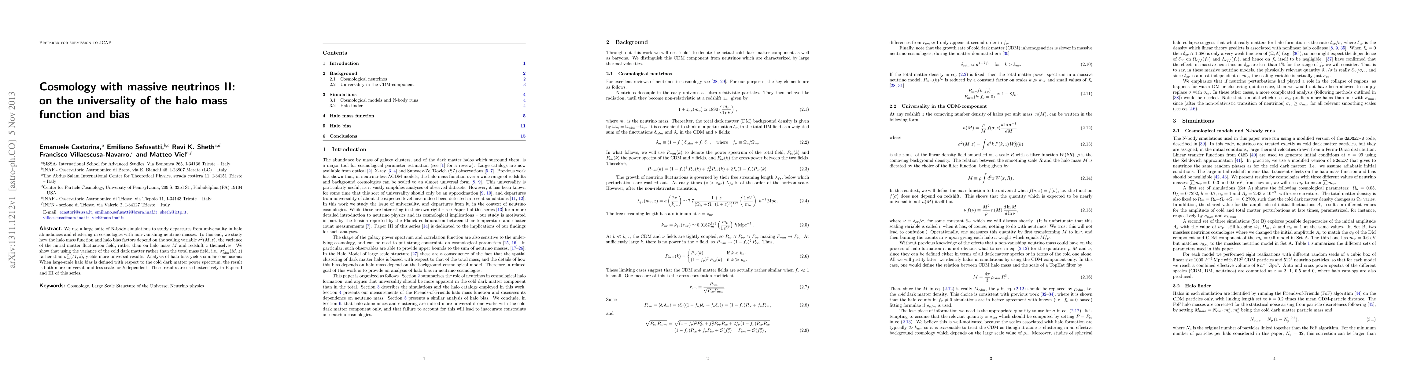 We use a large suite of N-body simulations to study departures from universality in halo abundances and clustering in cosmologies with non-vanishing neutrino masses. To this end, we study how the halo mass function and halo bias factors depend on the scaling variable $\sigma^2(M,z)$, the variance of the initial matter fluctuation field, rather than on halo mass $M$ and redshift $z$ themselves. We show that using the variance of the cold dark matter rather than the total mass field, i.e., $\sigma^2_{cdm}(M,z)$ rather than $\sigma^2_{m}(M,z)$, yields more universal results. Analysis of halo bias yields similar conclusions: When large-scale halo bias is defined with respect to the cold dark matter power spectrum, the result is both more universal, and less scale- or $k$-dependent. These results are used extensively in Papers I and III of this series.