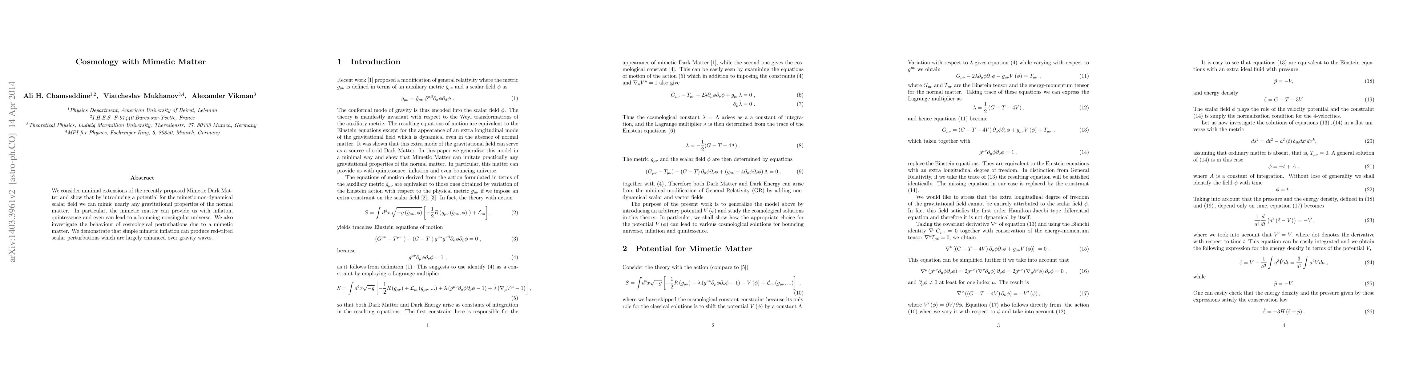 The paper introduces a novel approach to cosmology by extending mimetic matter theory with a potential, allowing it to mimic various forms of matter and energy, including inflaton and quintessence.