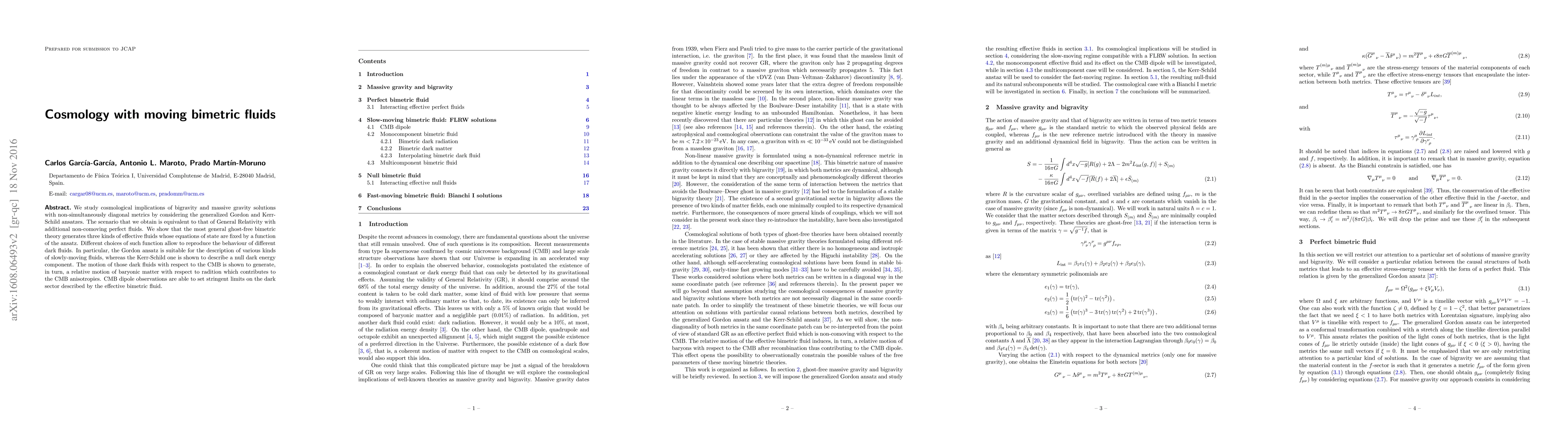 We study cosmological implications of bigravity and massive gravity solutions with non-simultaneously diagonal metrics by considering the generalized Gordon and Kerr-Schild ansatzes. The scenario that we obtain is equivalent to that of General Relativity with additional non-comoving perfect fluids. We show that the most general ghost-free bimetric theory generates three kinds of effective fluids whose equations of state are fixed by a function of the ansatz. Different choices of such function allow to reproduce the behaviour of different dark fluids. In particular, the Gordon ansatz is suitable for the description of various kinds of slowly-moving fluids, whereas the Kerr-Schild one is shown to describe a null dark energy component. The motion of those dark fluids with respect to the CMB is shown to generate, in turn, a relative motion of baryonic matter with respect to radition which contributes to the CMB anisotropies. CMB dipole observations are able to set stringent limits on the dark sector described by the effective bimetric fluid.