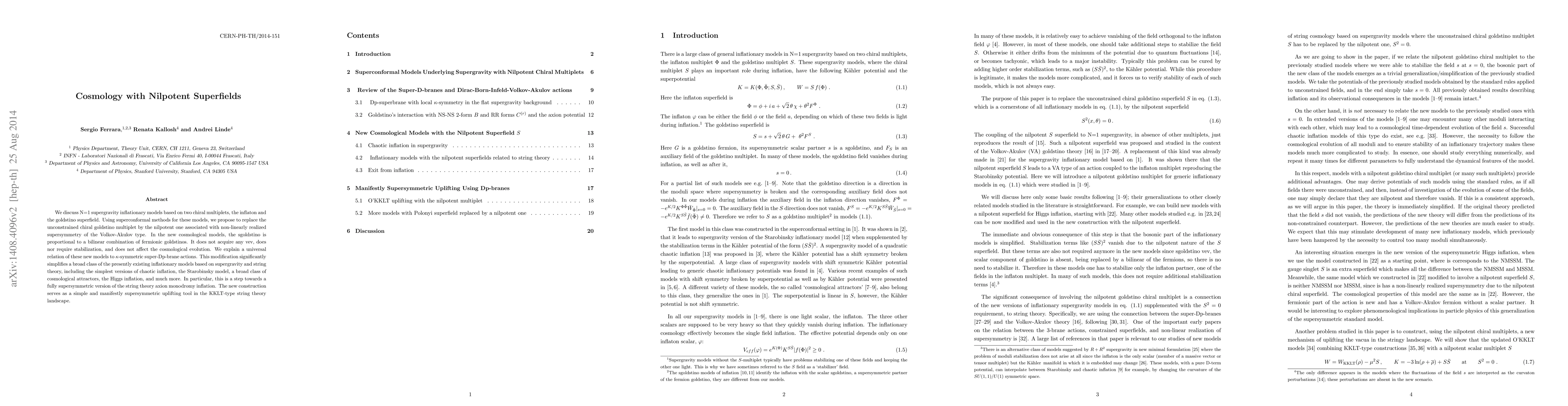 This paper proposes a new cosmological model using nilpotent superfields to replace the goldstino superfield in N=1 supergravity inflationary models, simplifying existing inflationary frameworks and providing a supersymmetric uplifting tool in string theory landscapes. The sgoldstino does not require stabilization and does not affect cosmological evolution.