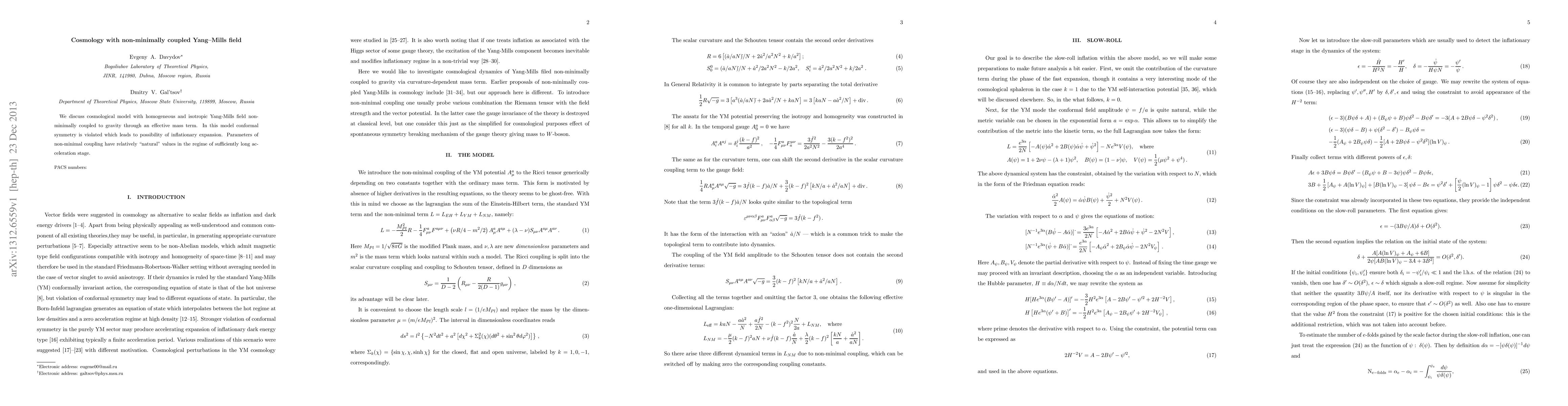 We discuss cosmological model with homogeneous and isotropic Yang-Mills field non-minimally coupled to gravity through an effective mass term. In this model conformal symmetry is violated which leads to possibility of inflationary expansion. Parameters of non-minimal coupling have relatively ``natural'' values in the regime of sufficiently long acceleration stage.