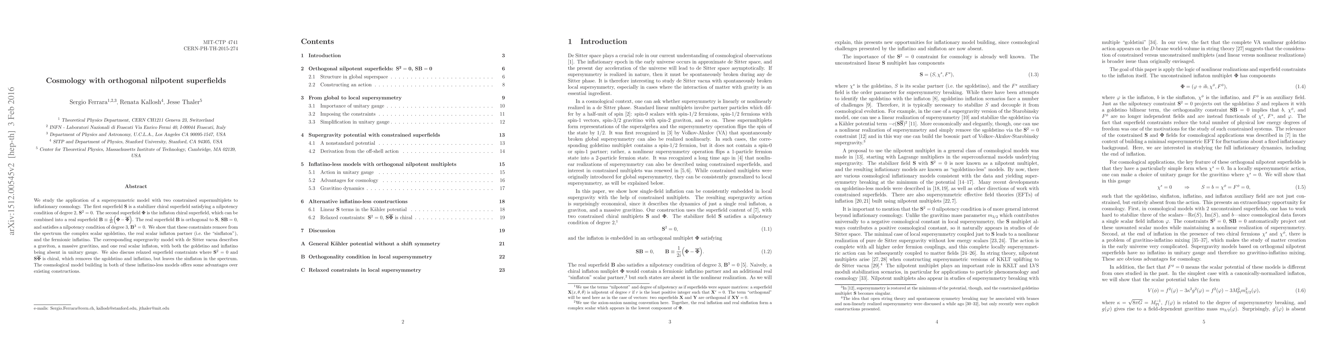 This paper explores a supersymmetric model with orthogonal nilpotent superfields for inflationary cosmology, demonstrating that constraints on the superfields remove unwanted particles like the sgoldstino and inflatino, while maintaining a viable real scalar inflaton. The model offers advantages over traditional constructions by simplifying the spectrum.
