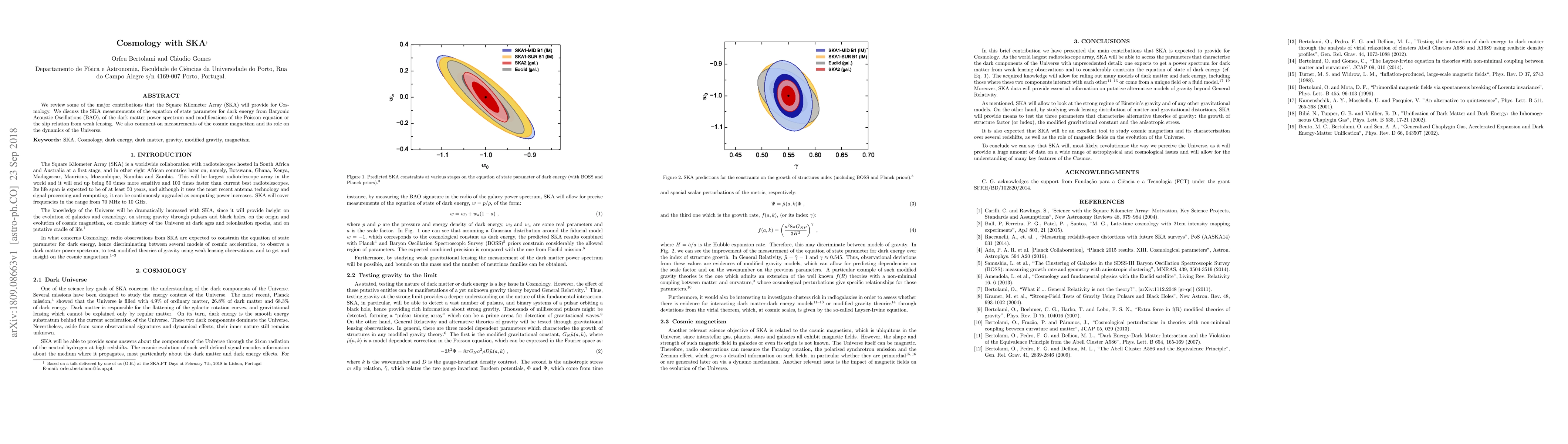 The Square Kilometer Array (SKA) will significantly advance cosmology by measuring the equation of state parameter for dark energy via Baryonic Acoustic Oscillations (BAO), the dark matter power spectrum, and cosmic magnetism's influence on the universe's dynamics through weak lensing.