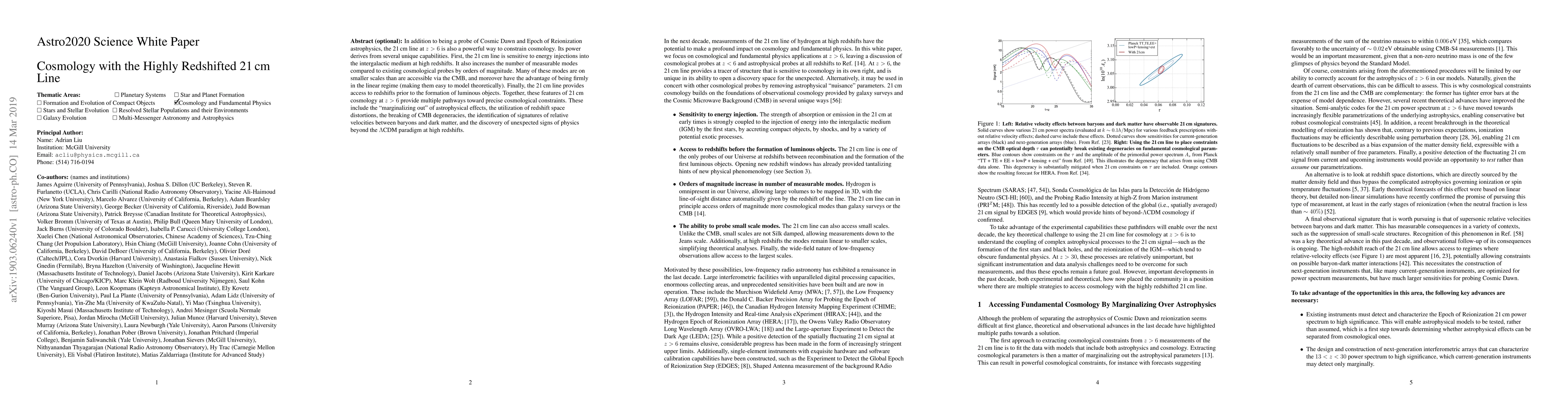 In addition to being a probe of Cosmic Dawn and Epoch of Reionization astrophysics, the 21cm line at $z>6$ is also a powerful way to constrain cosmology. Its power derives from several unique capabilities. First, the 21cm line is sensitive to energy injections into the intergalactic medium at high redshifts. It also increases the number of measurable modes compared to existing cosmological probes by orders of magnitude. Many of these modes are on smaller scales than are accessible via the CMB, and moreover have the advantage of being firmly in the linear regime (making them easy to model theoretically). Finally, the 21cm line provides access to redshifts prior to the formation of luminous objects. Together, these features of 21cm cosmology at $z>6$ provide multiple pathways toward precise cosmological constraints. These include the "marginalizing out" of astrophysical effects, the utilization of redshift space distortions, the breaking of CMB degeneracies, the identification of signatures of relative velocities between baryons and dark matter, and the discovery of unexpected signs of physics beyond the $\Lambda$CDM paradigm at high redshifts.
