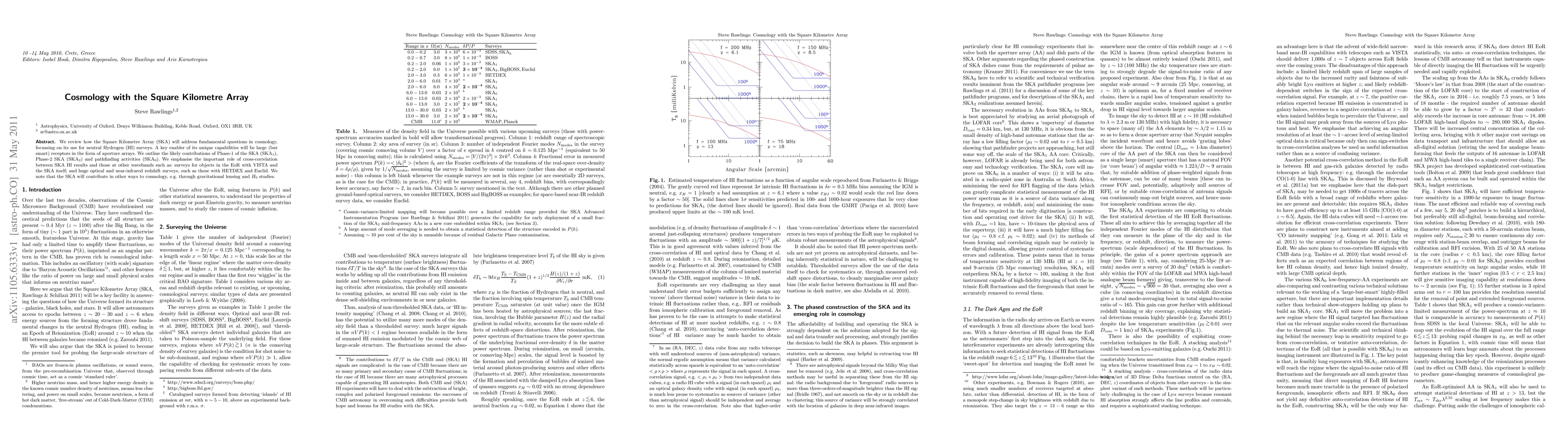 We review how the Square Kilometre Array (SKA) will address fundamental questions in cosmology, focussing on its use for neutral Hydrogen (HI) surveys. A key enabler of its unique capabilities will be large (but smart) receptors in the form of aperture arrays. We outline the likely contributions of Phase-1 of the SKA (SKA1), Phase-2 SKA (SKA2) and pathfinding activities (SKA0). We emphasise the important role of cross-correlation between SKA HI results and those at other wavebands such as: surveys for objects in the EoR with VISTA and the SKA itself; and huge optical and near-infrared redshift surveys, such as those with HETDEX and Euclid. We note that the SKA will contribute in other ways to cosmology, e.g. through gravitational lensing and $H_{0}$ studies.