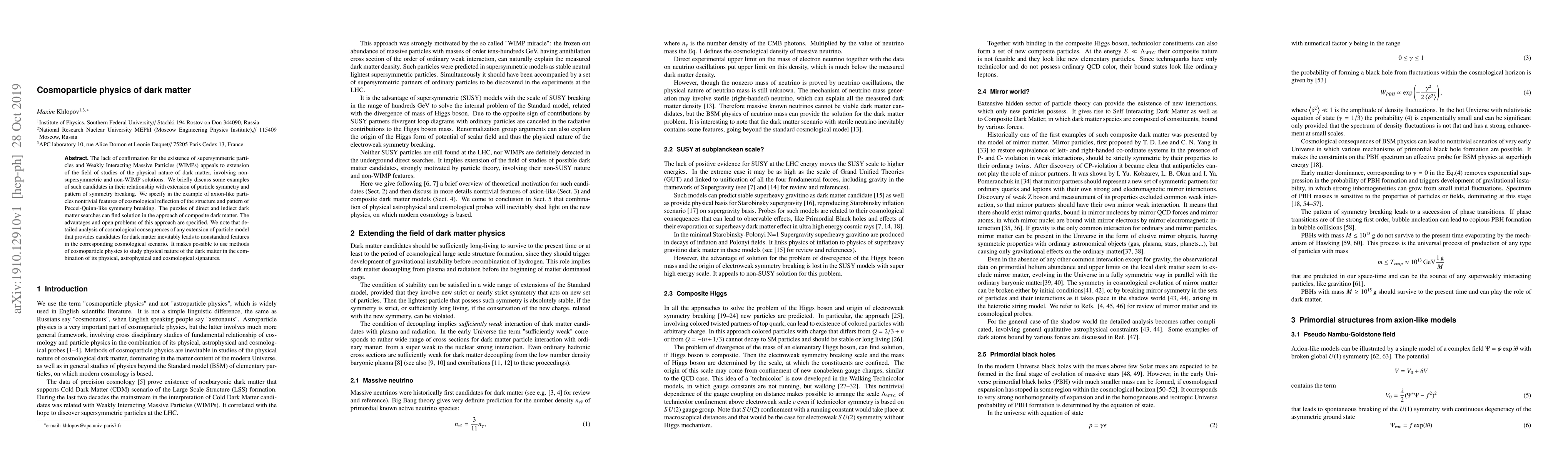 The lack of confirmation for the existence of supersymmetric particles and Weakly Interacting Massive Particles (WIMPs) appeals to extension of the field of studies of the physical nature of dark matter, involving non-supersymmetric and non-WIMP solutions. We briefly discuss some examples of such candidates in their relationship with extension of particle symmetry and pattern of symmetry breaking. We specify in the example of axion-like particles nontrivial features of cosmological reflection of the structure and pattern of Peccei-Quinn-like symmetry breaking. The puzzles of direct and indiect dark matter searches can find solution in the approach of composite dark matter. The advantages and open problems of this approach are specified. We note that detailed analysis of cosmological consequences of any extension of particle model that provides candidates for dark matter inevitably leads to nonstandard features in the corresponding cosmological scenario. It makes possible to use methods of cosmoparticle physics to study physical nature of the dark matter in the combination of its physical, astrophysical and cosmological signatures.