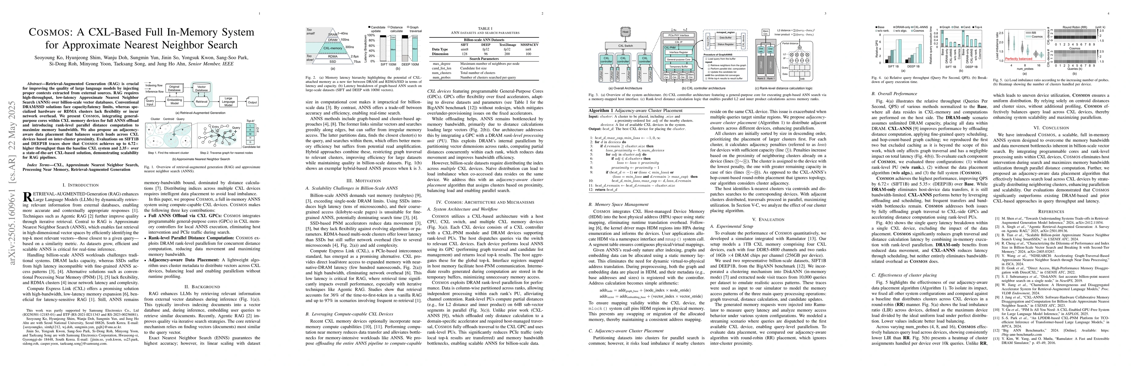 Cosmos improves large language model quality by offloading Approximate Nearest Neighbor Search to CXL memory devices, achieving up to 6.72x higher throughput than baseline systems.