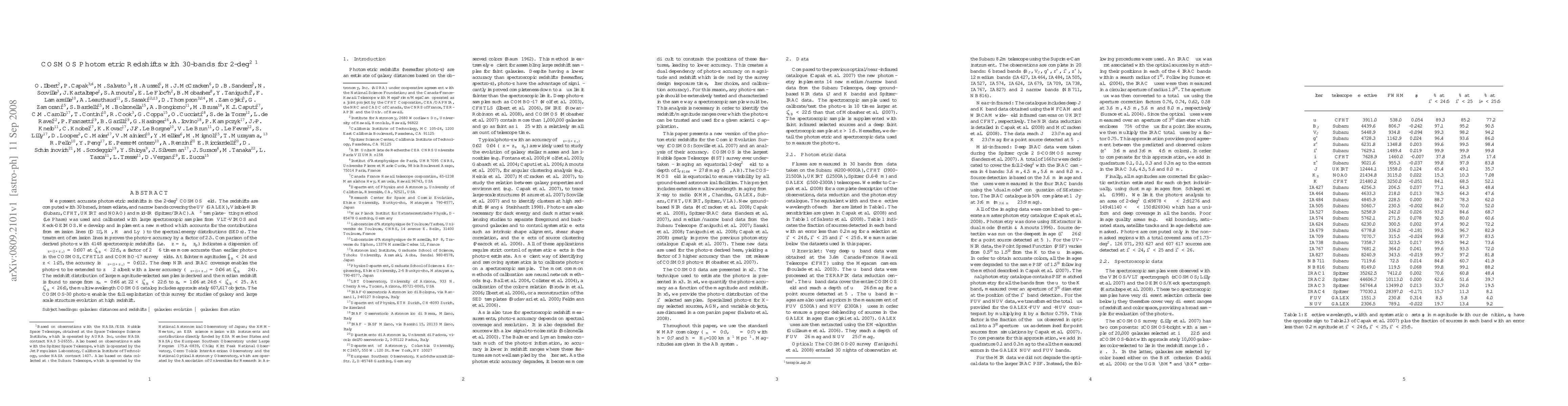 We present accurate photometric redshifts in the 2-deg2 COSMOS field. The redshifts are computed with 30 broad, intermediate, and narrow bands covering the UV (GALEX), Visible-NIR (Subaru, CFHT, UKIRT and NOAO) and mid-IR (Spitzer/IRAC). A chi2 template-fitting method (Le Phare) was used and calibrated with large spectroscopic samples from VLT-VIMOS and Keck-DEIMOS. We develop and implement a new method which accounts for the contributions from emission lines (OII, Hbeta, Halpha and Ly) to the spectral energy distributions (SEDs). The treatment of emission lines improves the photo-z accuracy by a factor of 2.5. Comparison of the derived photo-z with 4148 spectroscopic redshifts (i.e. Delta z = zs - zp) indicates a dispersion of sigma_{Delta z/(1+zs)}=0.007 at i<22.5, a factor of 2-6 times more accurate than earlier photo-z in the COSMOS, CFHTLS and COMBO-17 survey fields. At fainter magnitudes i<24 and z<1.25, the accuracy is sigma_{Delta z/(1+zs)}=0.012. The deep NIR and IRAC coverage enables the photo-z to be extended to z~2 albeit with a lower accuracy (sigma_{Delta z/(1+zs)}=0.06 at i~24). The redshift distribution of large magnitude-selected samples is derived and the median redshift is found to range from z=0.66 at 22