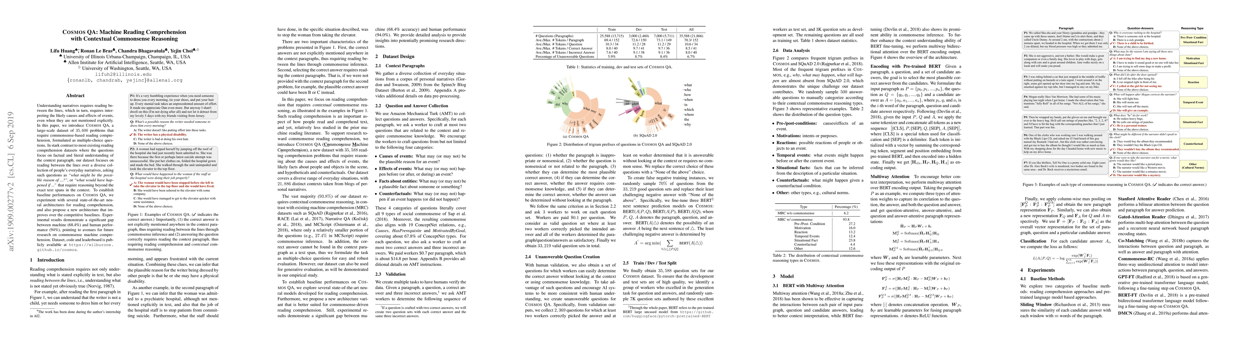 This paper introduces Cosmos QA, a large-scale dataset designed to test machine reading comprehension that requires commonsense reasoning, featuring 35,600 multiple-choice questions. The dataset emphasizes understanding between the lines in everyday narratives, highlighting a significant gap between machine (68.4%) and human (94%) performance, indicating room for future advancements in commonsense comprehension.
