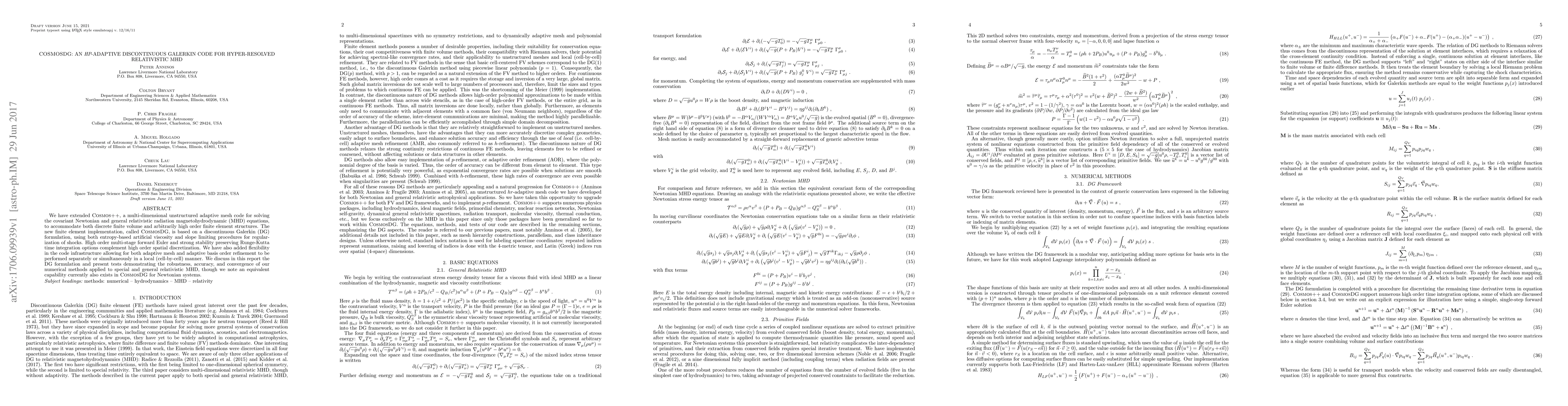 We have extended Cosmos++, a multi-dimensional unstructured adaptive mesh code for solving the covariant Newtonian and general relativistic radiation magnetohydrodynamic (MHD) equations, to accommodate both discrete finite volume and arbitrarily high order finite element structures. The new finite element implementation, called CosmosDG, is based on a discontinuous Galerkin (DG) formulation, using both entropy-based artificial viscosity and slope limiting procedures for regularization of shocks. High order multi-stage forward Euler and strong stability preserving Runge-Kutta time integration options complement high order spatial discretization. We have also added flexibility in the code infrastructure allowing for both adaptive mesh and adaptive basis order refinement to be performed separately or simultaneously in a local (cell-by-cell) manner. We discuss in this report the DG formulation and present tests demonstrating the robustness, accuracy, and convergence of our numerical methods applied to special and general relativistic MHD, though we note an equivalent capability currently also exists in CosmosDG for Newtonian systems.