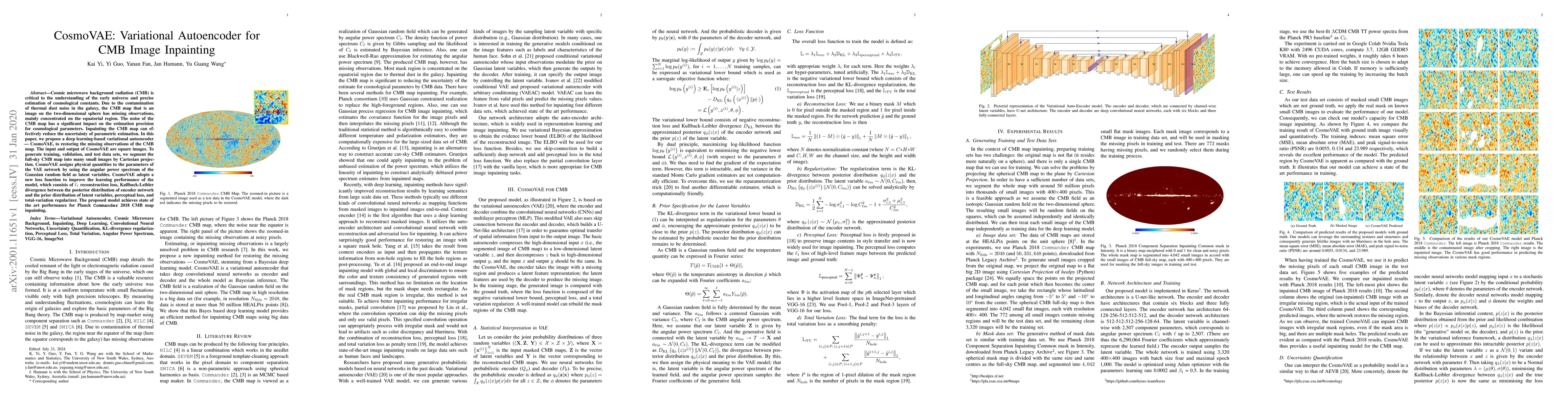 Cosmic microwave background radiation (CMB) is critical to the understanding of the early universe and precise estimation of cosmological constants. Due to the contamination of thermal dust noise in the galaxy, the CMB map that is an image on the two-dimensional sphere has missing observations, mainly concentrated on the equatorial region. The noise of the CMB map has a significant impact on the estimation precision for cosmological parameters. Inpainting the CMB map can effectively reduce the uncertainty of parametric estimation. In this paper, we propose a deep learning-based variational autoencoder --- CosmoVAE, to restoring the missing observations of the CMB map. The input and output of CosmoVAE are square images. To generate training, validation, and test data sets, we segment the full-sky CMB map into many small images by Cartesian projection. CosmoVAE assigns physical quantities to the parameters of the VAE network by using the angular power spectrum of the Gaussian random field as latent variables. CosmoVAE adopts a new loss function to improve the learning performance of the model, which consists of $\ell_1$ reconstruction loss, Kullback-Leibler divergence between the posterior distribution of encoder network and the prior distribution of latent variables, perceptual loss, and total-variation regularizer. The proposed model achieves state of the art performance for Planck \texttt{Commander} 2018 CMB map inpainting.
