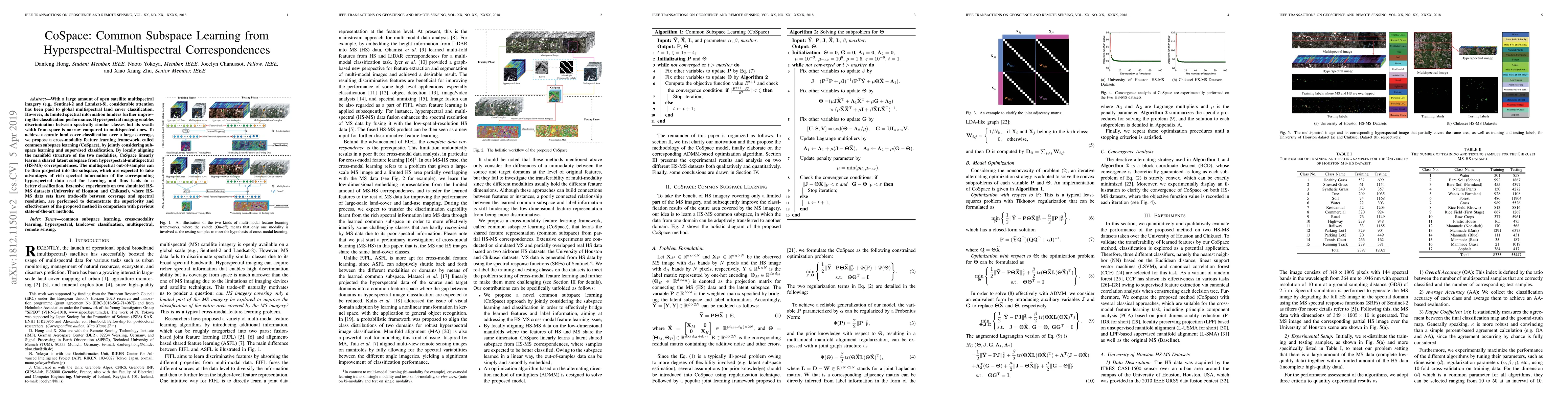 The paper proposes CoSpace, a common subspace learning framework for improving land cover classification using both hyperspectral and multispectral satellite imagery. This method aligns the manifold structures of the two modalities to learn a shared latent subspace, enhancing multispectral classification with hyperspectral spectral information.