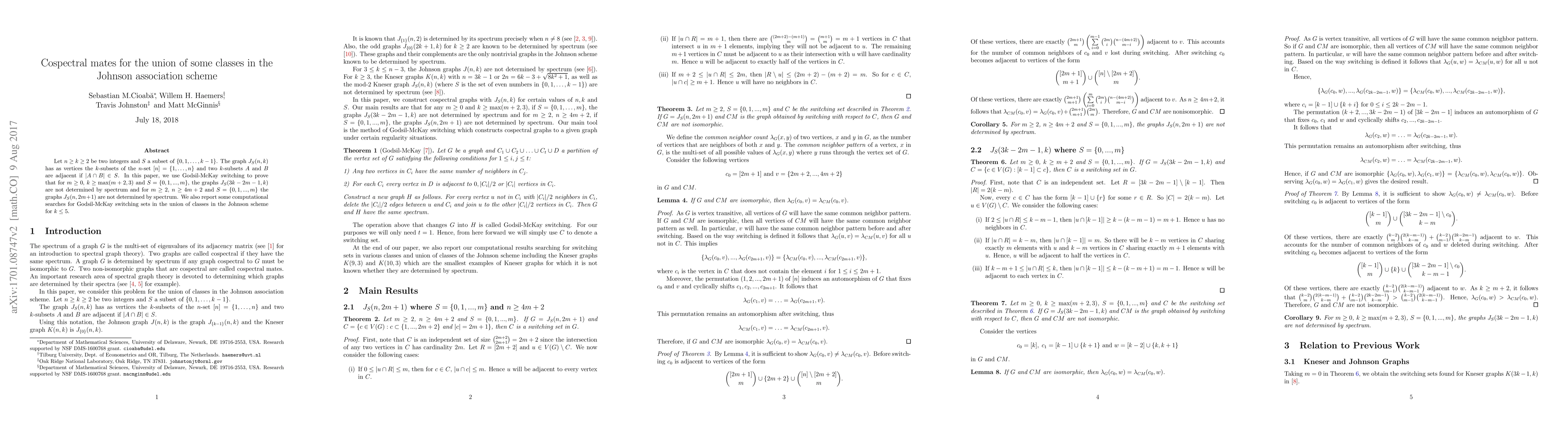 Let $n\geq k\geq 2$ be two integers and $S$ a subset of $\{0,1,\dots,k-1\}$. The graph $J_{S}(n,k)$ has as vertices the $k$-subsets of the $n$-set $[n]=\{1,\dots,n\}$ and two $k$-subsets $A$ and $B$ are adjacent if $|A\cap B|\in S$. In this paper, we use Godsil-McKay switching to prove that for $m\geq 0$, $k\geq \max(m+2,3)$ and $S = \{0, 1, ..., m\}$, the graphs $J_S(3k-2m-1,k)$ are not determined by spectrum and for $m\geq 2$, $n\geq 4m+2$ and $S = \{0,1,...,m\}$ the graphs $J_{S}(n,2m+1)$ are not determined by spectrum. We also report some computational searches for Godsil-McKay switching sets in the union of classes in the Johnson scheme for $k\leq 5$.