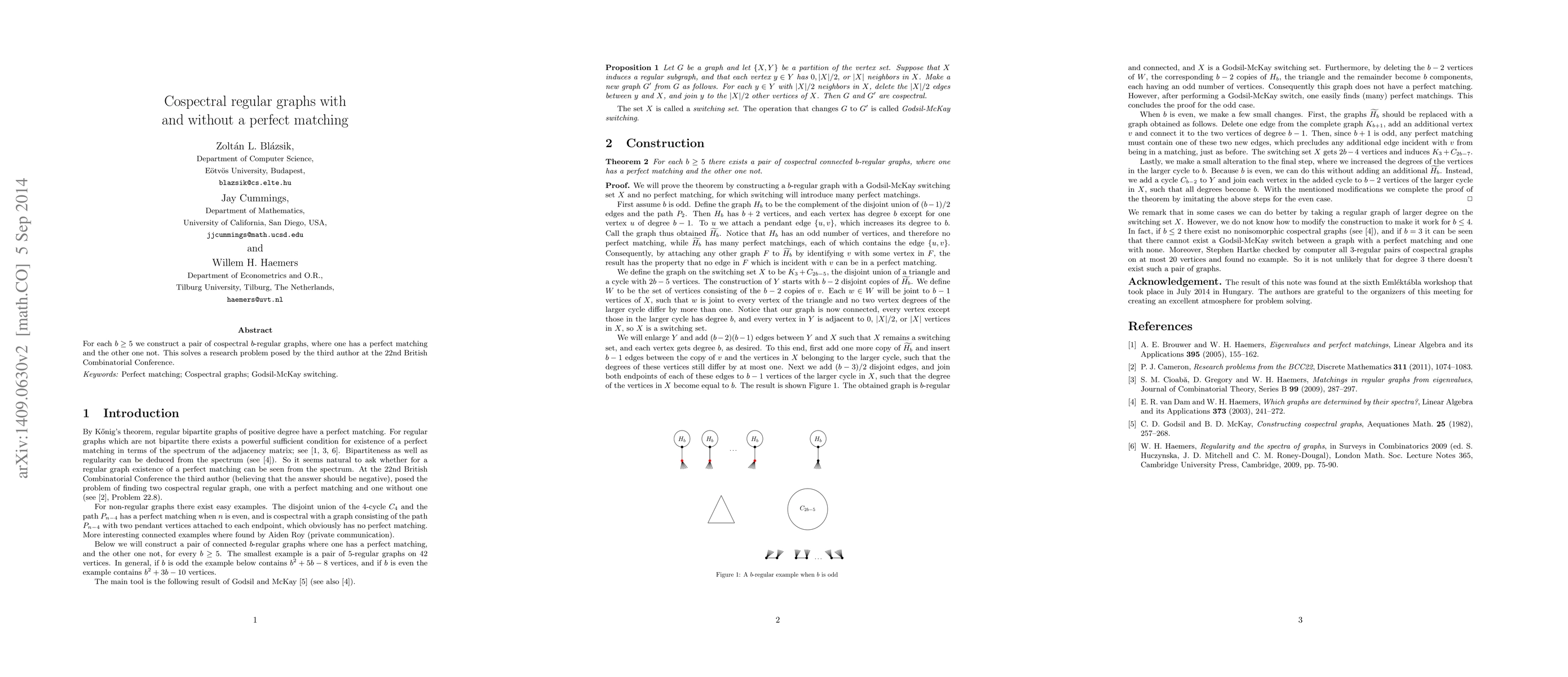 This paper constructs pairs of cospectral b-regular graphs, one with a perfect matching and the other without, solving a long-standing research problem in combinatorial graph theory. The construction provides insight into the properties of regular graphs and their relation to matchings.