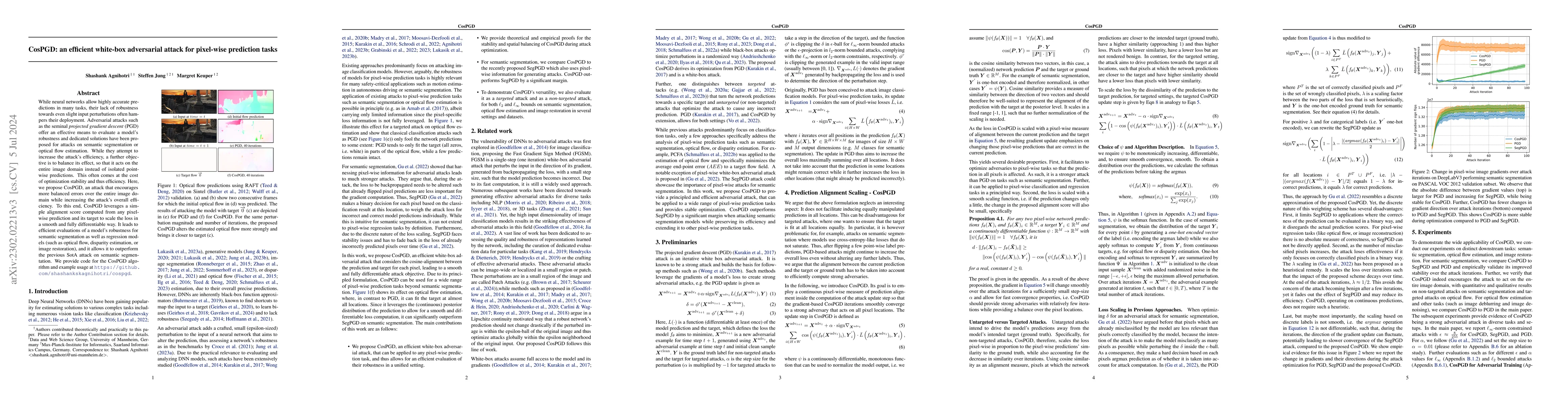 CosPGD introduces a unified white-box adversarial attack method for pixel-wise prediction tasks, extending beyond classification to semantic segmentation, optical flow, and image restoration. It outperforms existing state-of-the-art methods on semantic segmentation and sets new benchmarks for optical flow and image restoration.