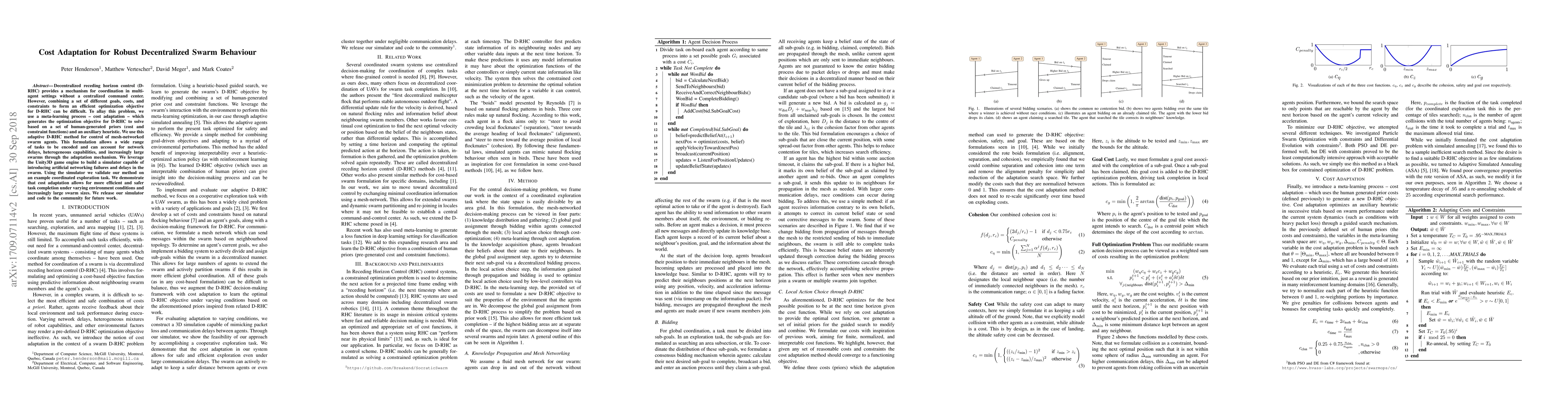 Decentralized receding horizon control (D-RHC) provides a mechanism for coordination in multi-agent settings without a centralized command center. However, combining a set of different goals, costs, and constraints to form an efficient optimization objective for D-RHC can be difficult. To allay this problem, we use a meta-learning process -- cost adaptation -- which generates the optimization objective for D-RHC to solve based on a set of human-generated priors (cost and constraint functions) and an auxiliary heuristic. We use this adaptive D-RHC method for control of mesh-networked swarm agents. This formulation allows a wide range of tasks to be encoded and can account for network delays, heterogeneous capabilities, and increasingly large swarms through the adaptation mechanism. We leverage the Unity3D game engine to build a simulator capable of introducing artificial networking failures and delays in the swarm. Using the simulator we validate our method on an example coordinated exploration task. We demonstrate that cost adaptation allows for more efficient and safer task completion under varying environment conditions and increasingly large swarm sizes. We release our simulator and code to the community for future work.